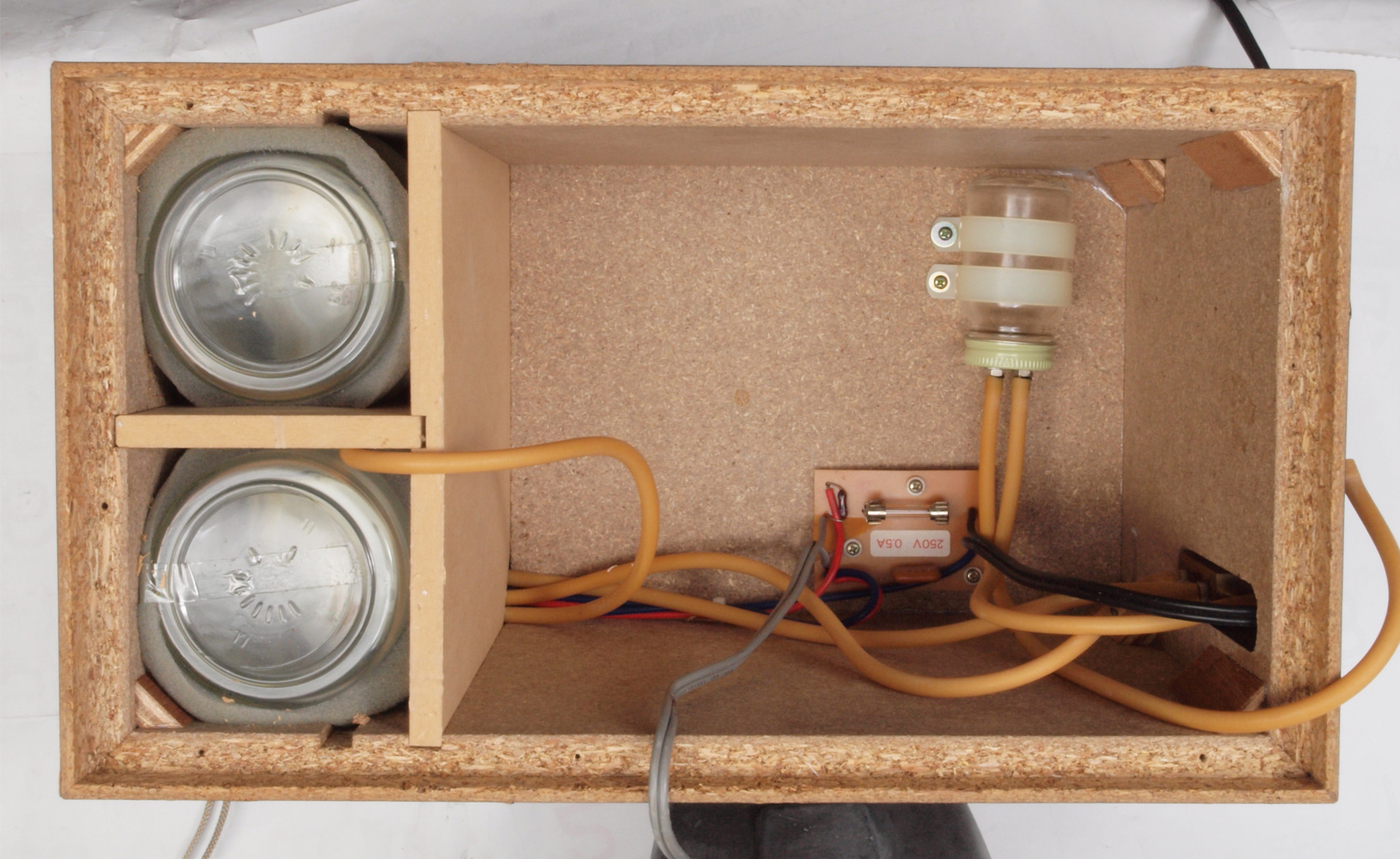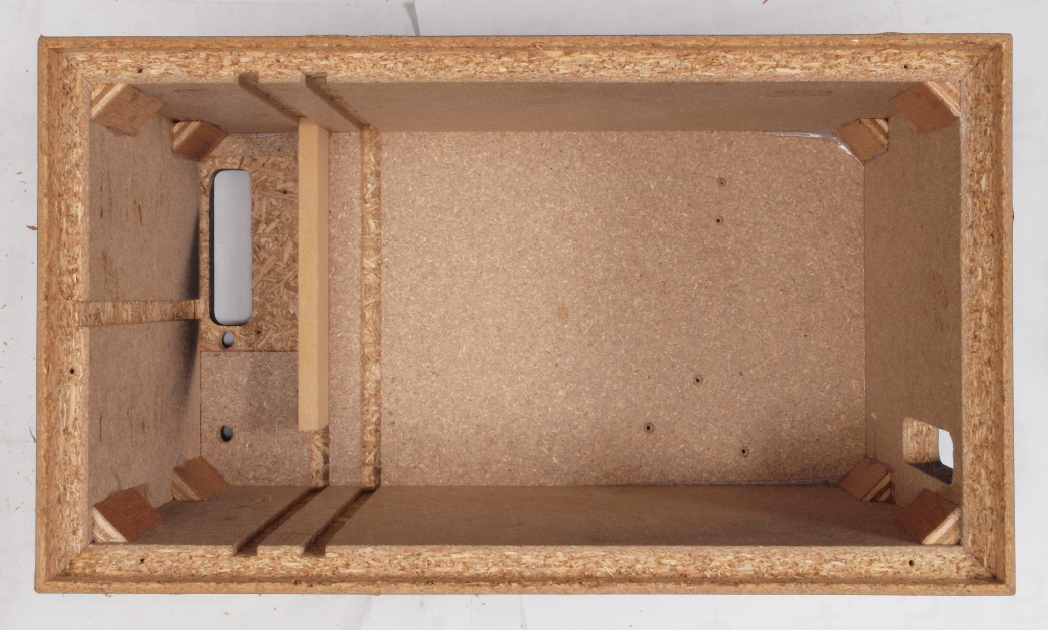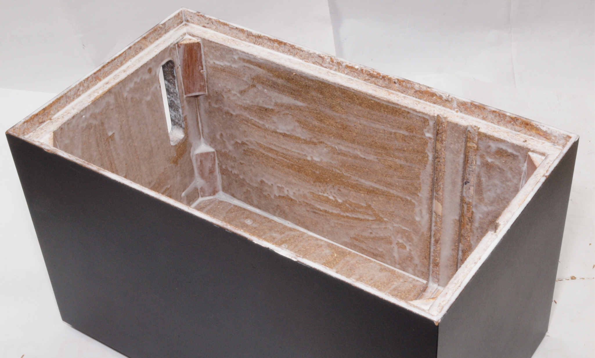 C35. 修理中 接着材が劣化した木箱、下後左から見る。圧縮板にボンドを塗って固めている。