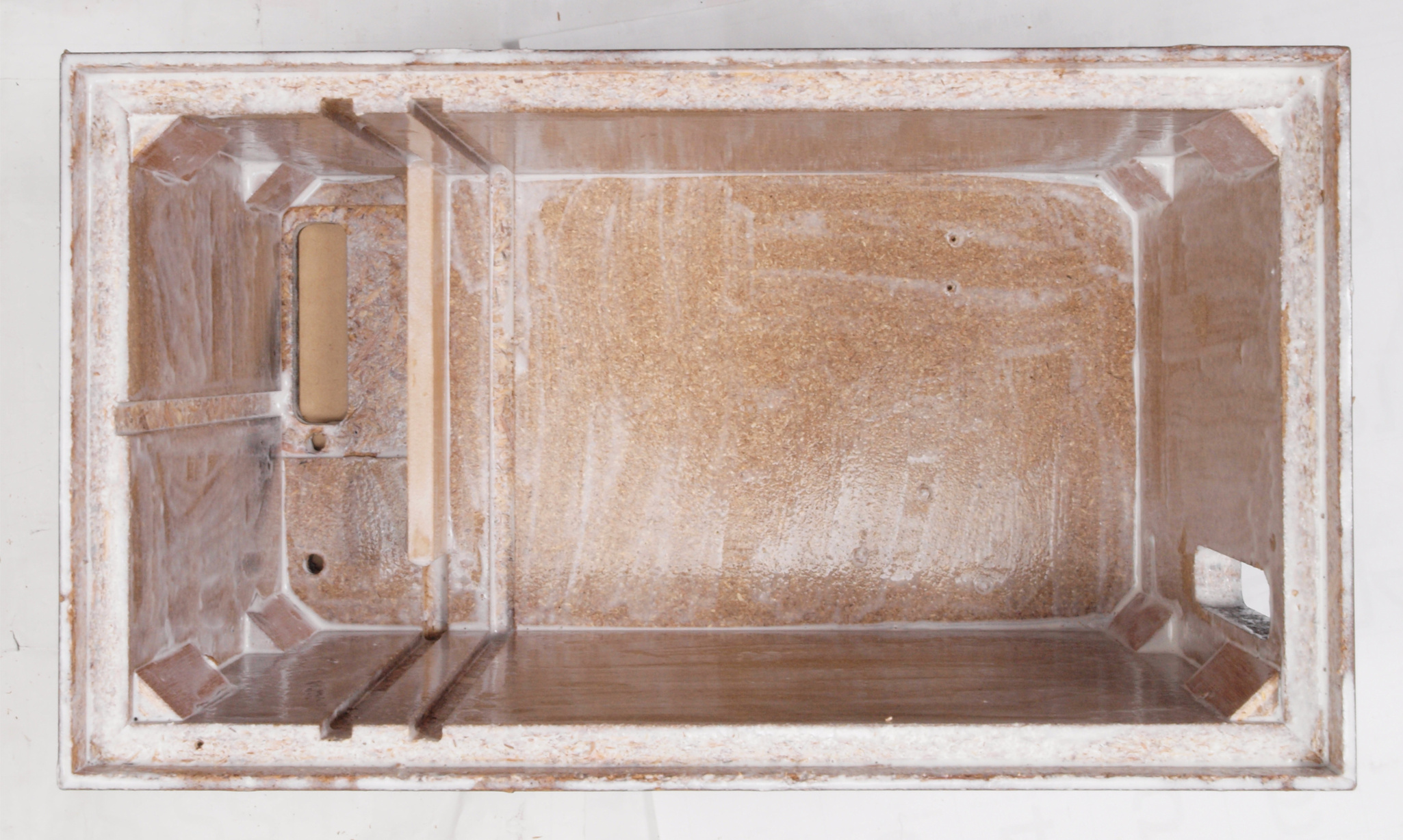 C34. 修理前 接着材が劣化した木箱、下後左から見る。