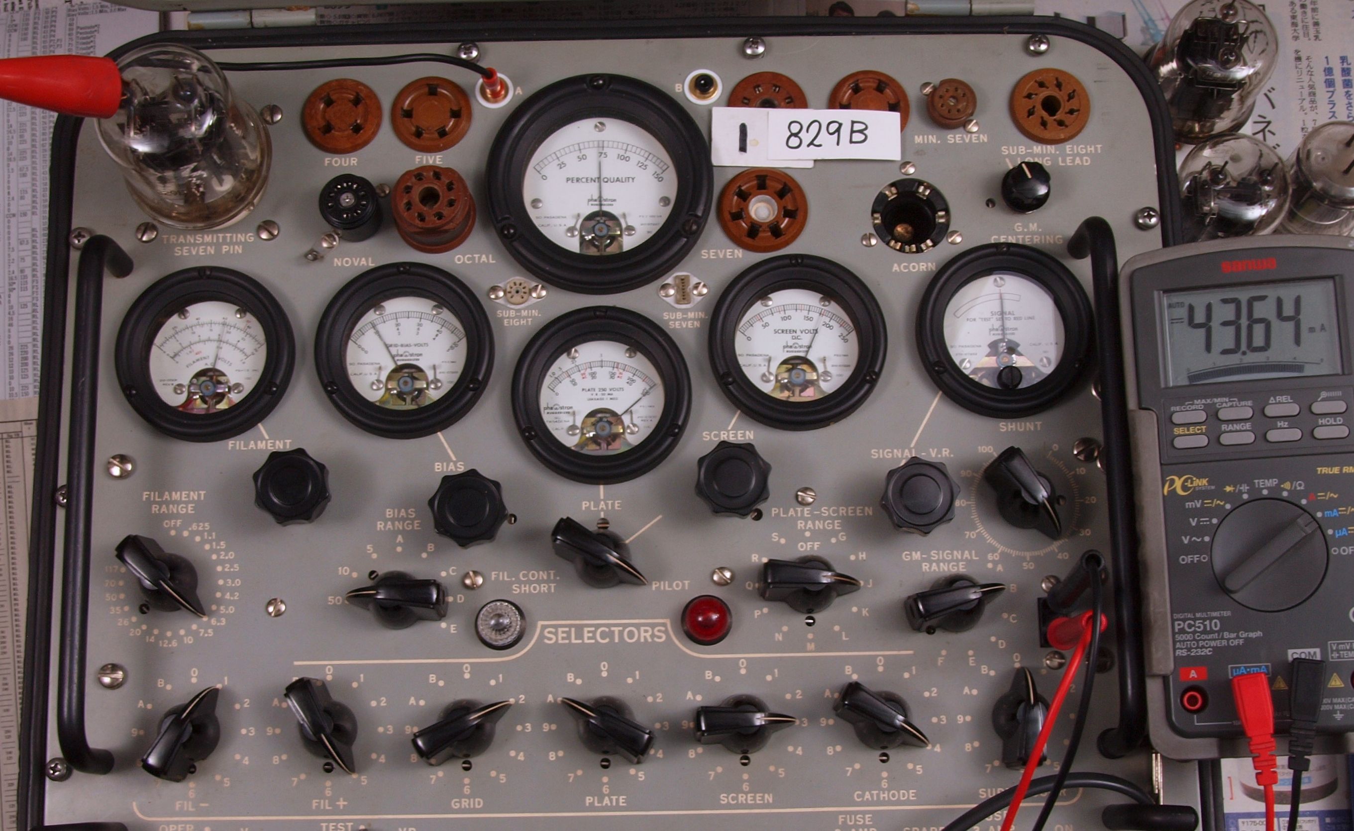 | A11. 1本目 829B ユニット1測定。 Gm=7000μmho、Ip=43.6mA。 測定条件、 「Ep=250V、Esg=175V、Eg1=−12V」RangeSW=C、FullScale=15000μmho。 |