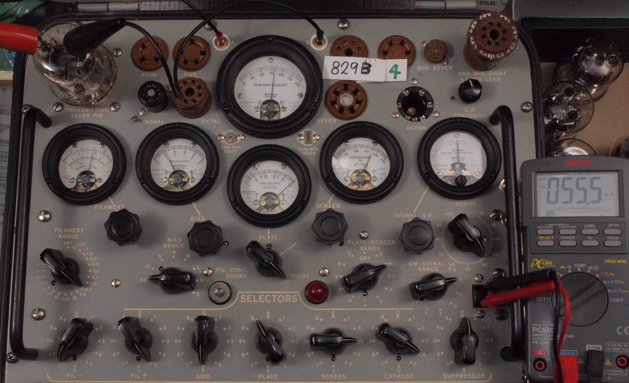 | B41. 4本目 829B ユニット1測定。 Gm=8000μmho、Ip=49.89mA。 測定条件、 「Ep=250V、Esg=175V、Eg1=−12V」RangeSW=C、FullScale=15000μmho。 |