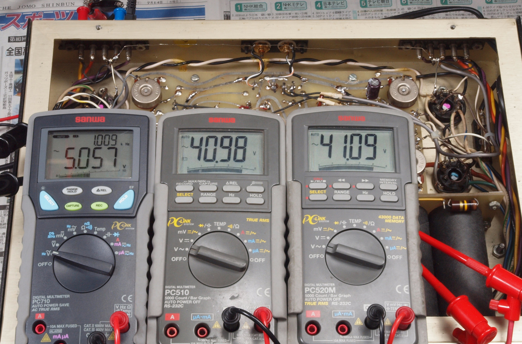 | MB5.LUX MB3045.5台目 出力トランス点検、 修理の様子はこちら 出力トランス電圧測定。16Ω端子にAC5.010V/1002Hzを入力=右端。 左端=1次プレート巻線(PA−B−PB)電圧=37.32V。 左から2番目=カソード巻線(KA−L−KB)間電圧=37.62V。 真中=ブーストラップ巻線(FA−C−FB)間電圧=37.43V。 右端から2番目=NF巻線(FC−G−FD)間電圧=37.25V。 |