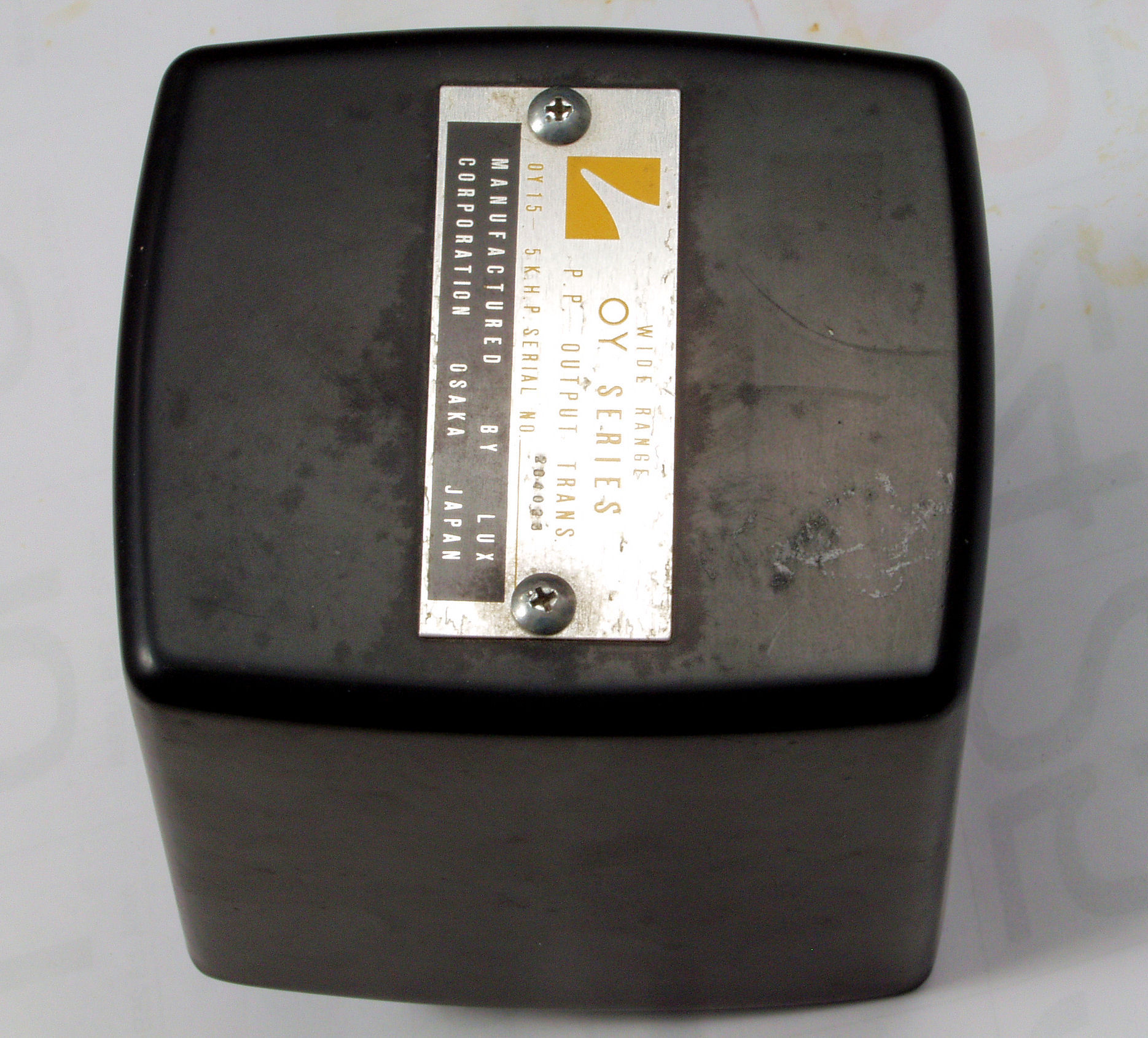 | L9. LUX SQ-38FD. 9台目 出力トランス点検。 修理の様子はこちら LUX OY15−5 の仕様。 1次インピーダンス=5kΩ(P1−B1間+B2−P2間)。 2次インピーダンス=16Ω(最大)。 インピーダンス比=5kΩ/16Ω=312.5、 巻き線比=17.68。 2次16Ω端子にAC5V/1kHzを入力すると、 1次巻線P1−B1間電圧=P2−B2間電圧=88.39V/2=44.19V。 |