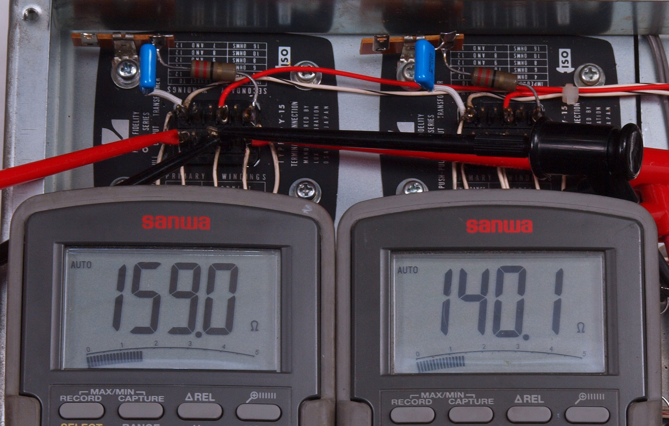 | L64. 左側出力トランス 抵抗測定で点検中。の抵抗測定。 1次巻き線P1−B1間抵抗=149.0Ω、 P2−B2間抵抗=159.5Ω。 |