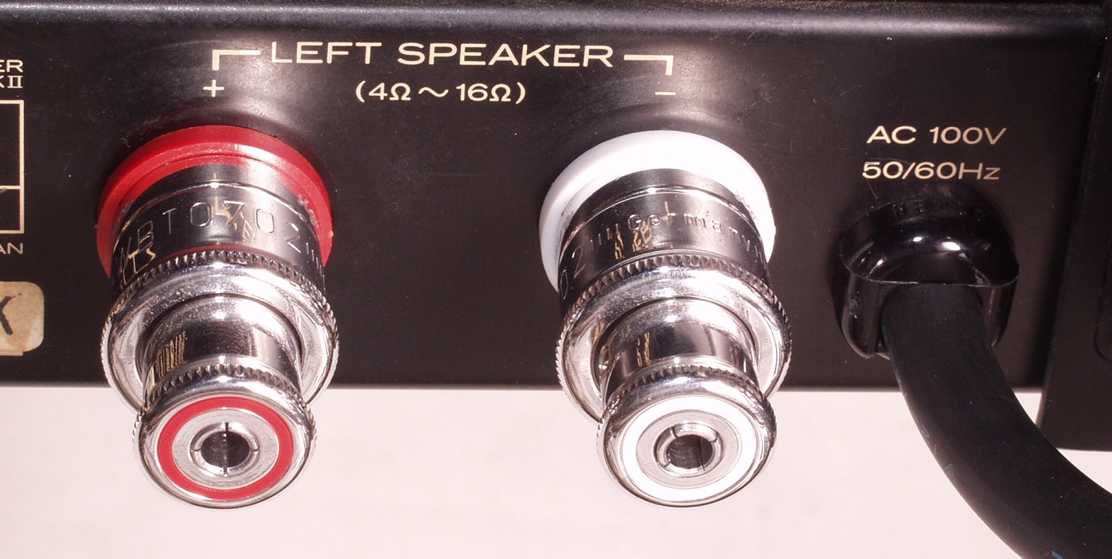 | 最近は、音質改善の為、極太のSP(スピーカー)ケーブルを使用する人が多い。 しかし、古い機器はそれら使用を想定しておらず、端子破損に成りやすい、出来る事なら、事前に補強すると良い。 又、ケーブルの重みで端子その物に負担が掛かり、接触不良や破壊に成りやすいので、架台等を利用してケーブルを固定して、端子に荷重が架からないようにすると良い。 |