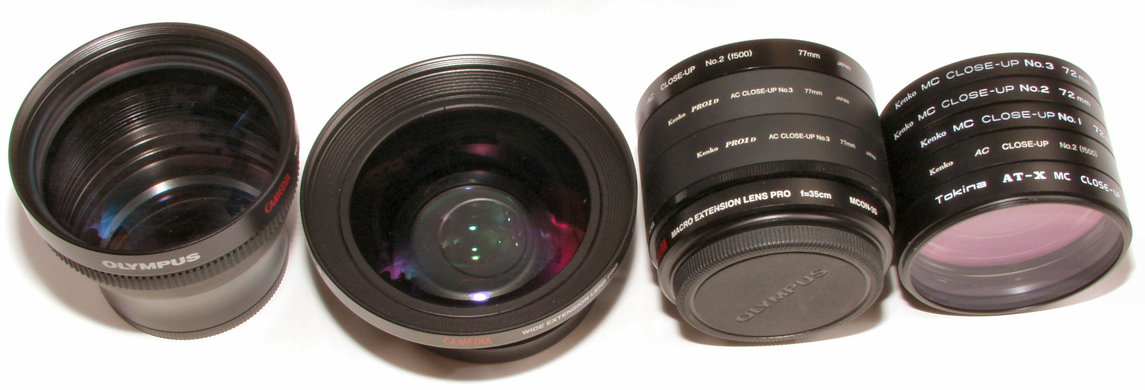 | 15. 左から、望遠「TCON−14B」、広角「WCON−08B」、マクロレンズ「MCON−35」+77mmクローズUPレンズ、72mmクローズUPレンズ。 | |