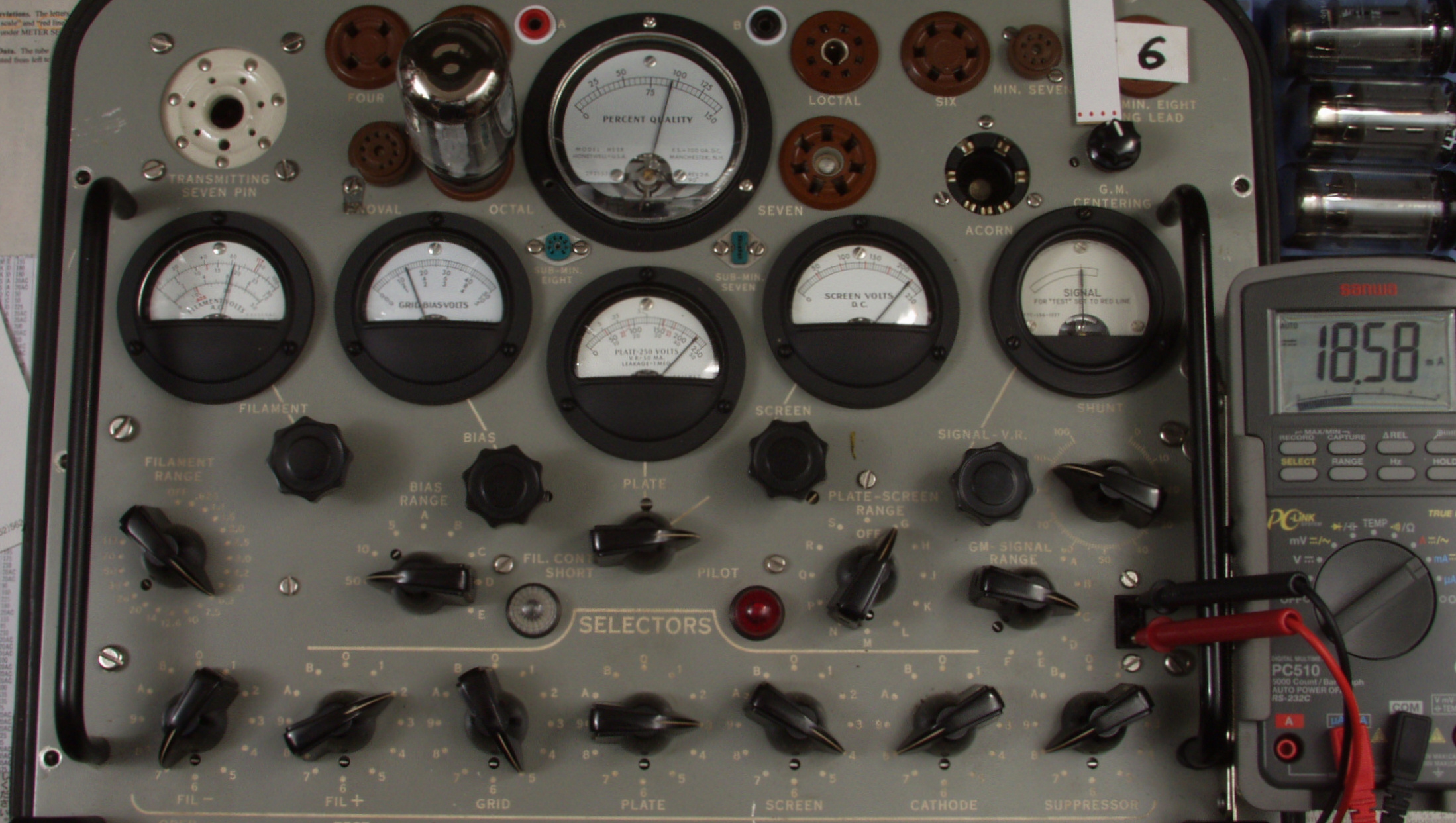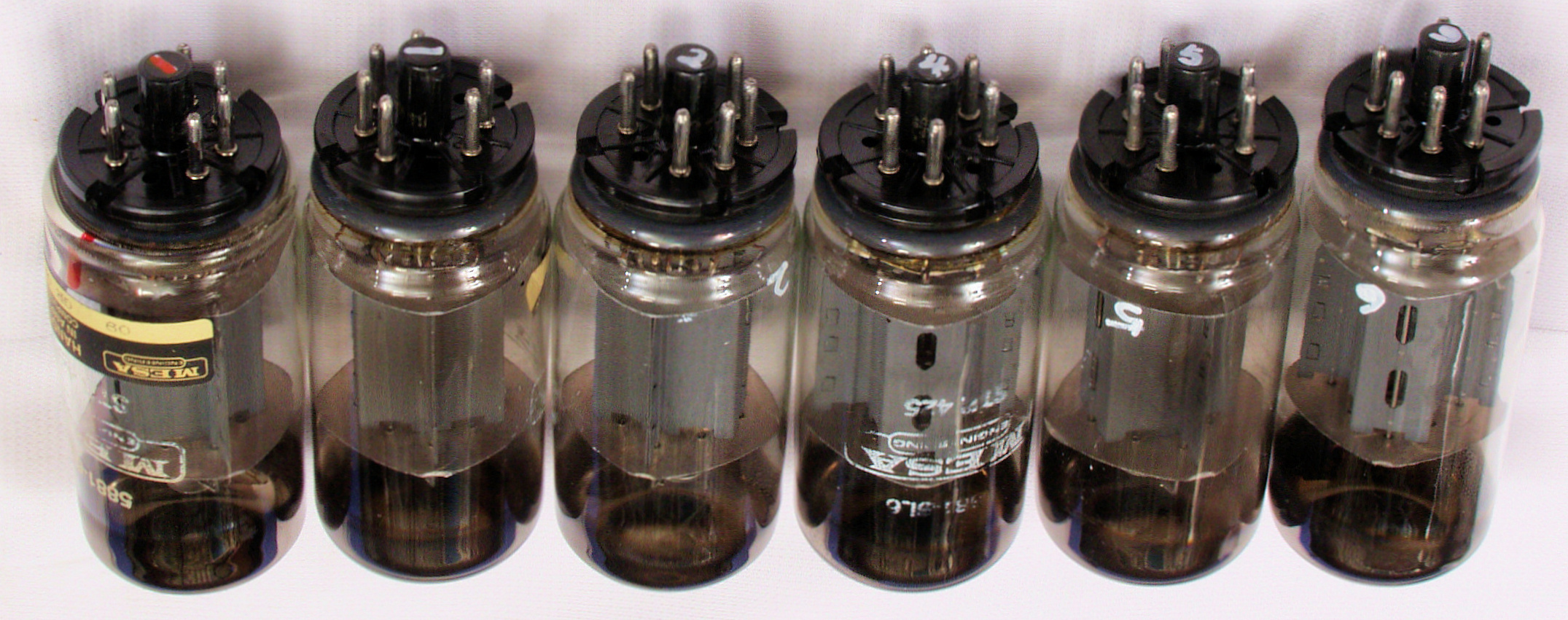 | CA. TubeTester HickokTV−2B/Uによる付属真空管測定 。 CA1. 付属出力真空管STR425 「5881=6L6」。 真空管ハンドブック(規格表)の値。 相互コンダクタンス=6000μmho「Ep=250V、Ip=72mA,Esg=250V、eg1=−14V」(1960/1962ナショナル真空管ハンドブックより) 相互コンダクタンス=6000μmho「Ep=250V、Ip=79mA,Esg=250V、eg1=−14V」(RC−26、RC−30 Receiving Tube Manualより)、(インプレス オーディオ用真空管マニアルより) STR425 「5881=6L6」。 左から予備球.1本目.2本目.4本目..6本目。 管壁の黒ずんだ所は、プレートが赤熱時放出した部質が蒸着した物。 |