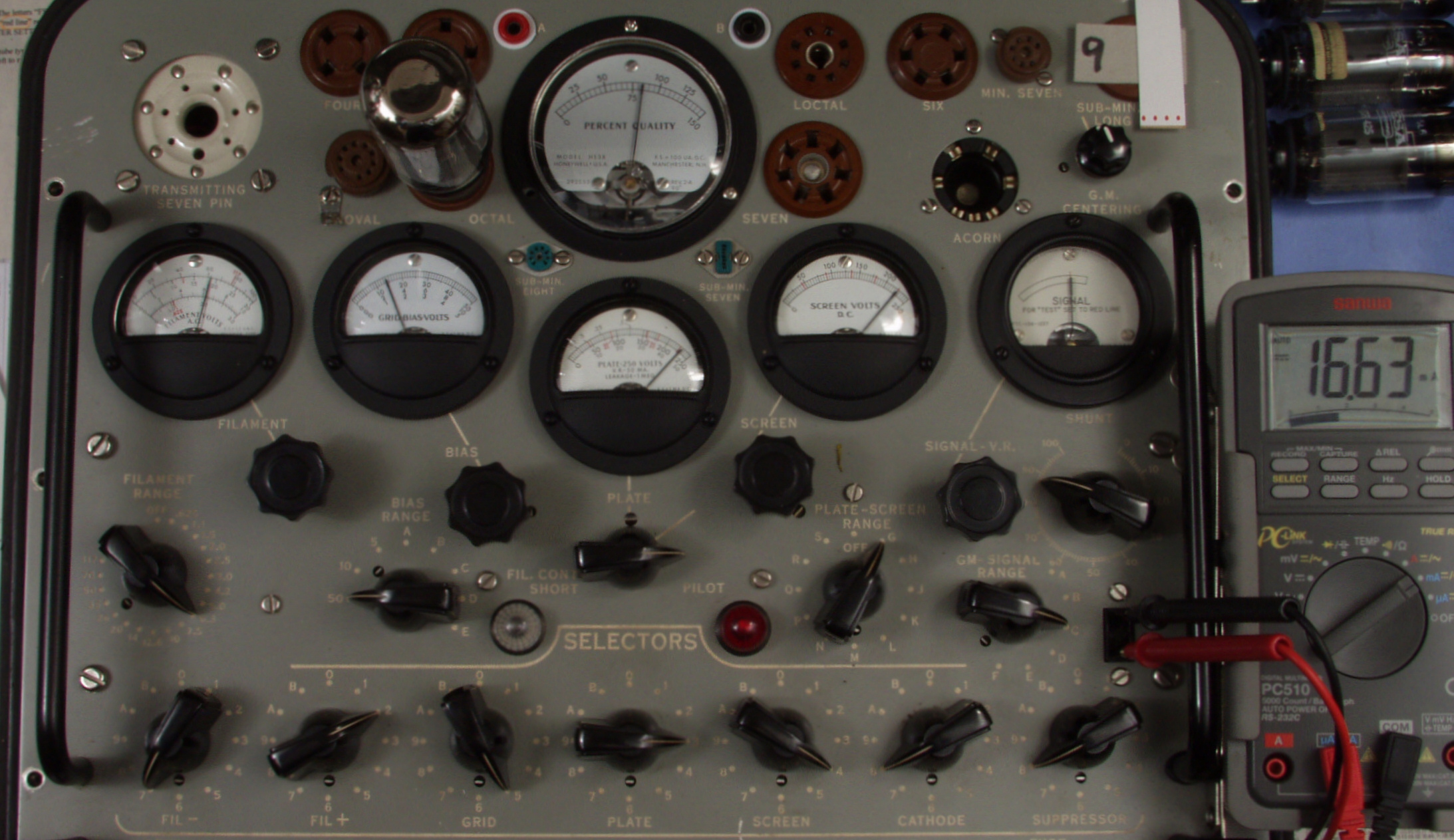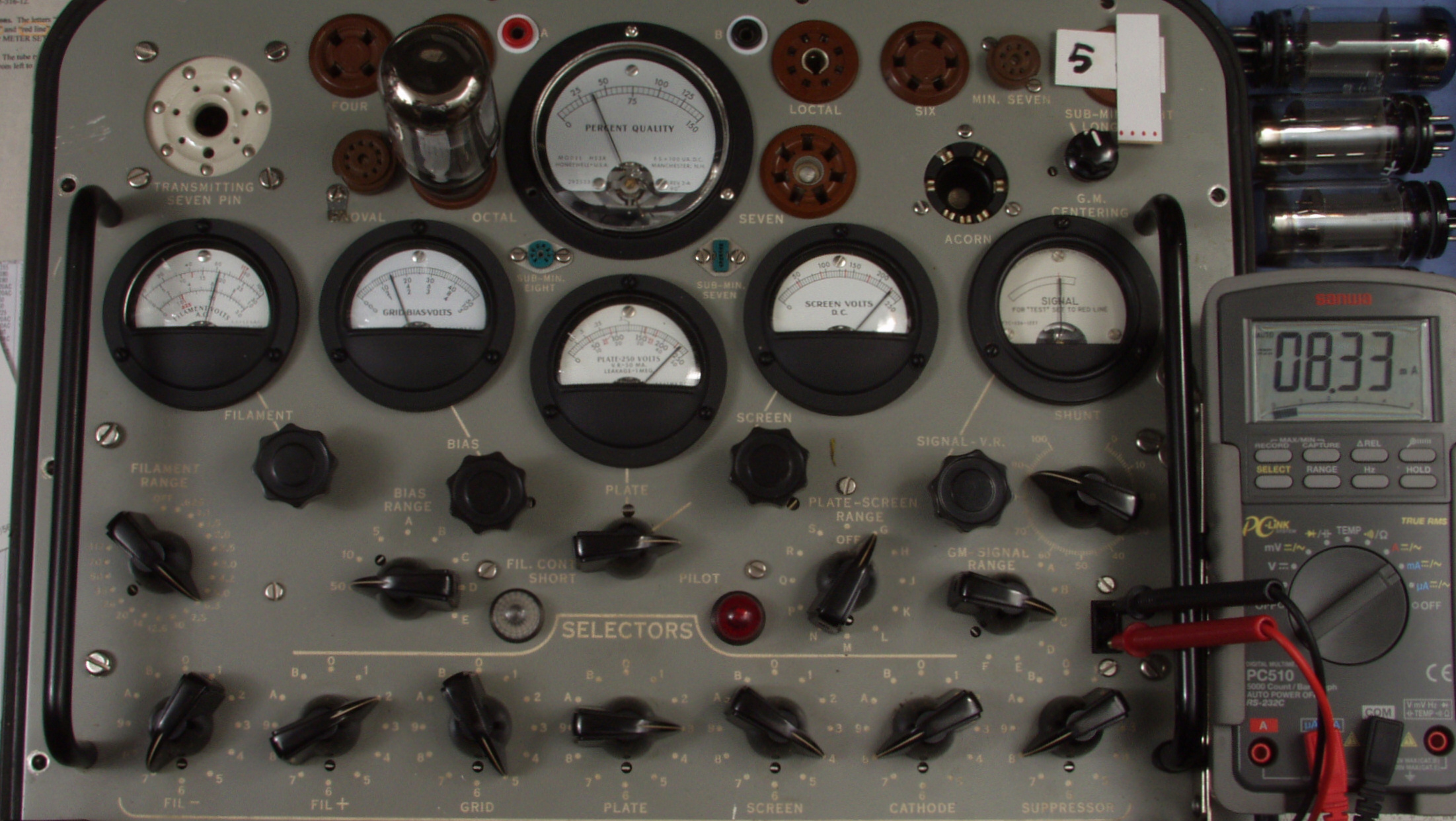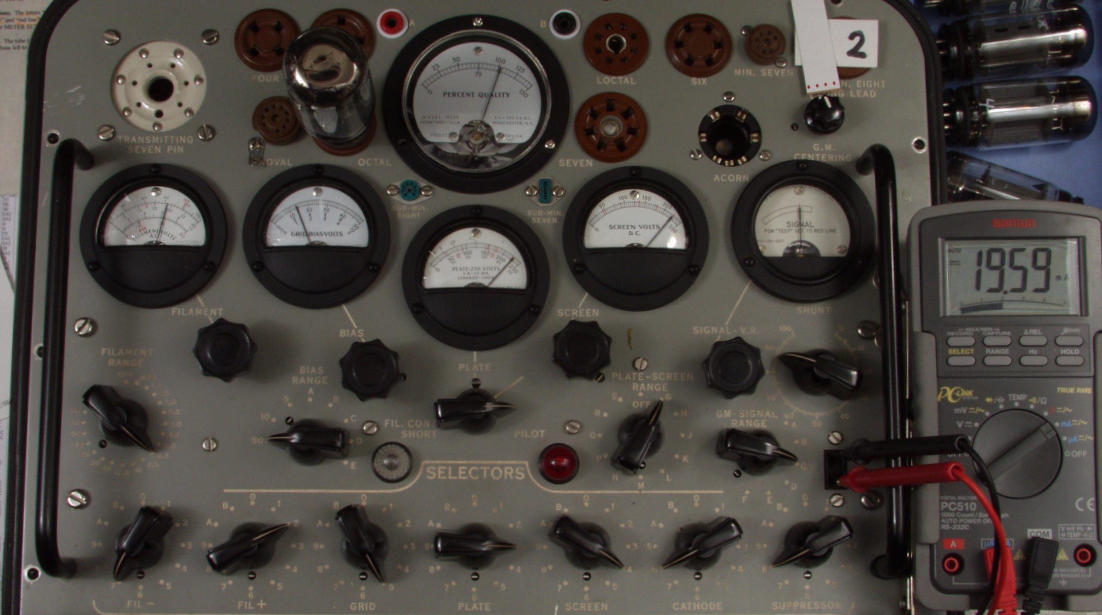 | CA10. 付属。 MESA STR 12AX7−A。 真空管ハンドブック(規格表)の値。 Dレンジ=1500μmhoレンジでの測定、「Ep=225V、Eg1=−2V」。 相互コンダクタンス=1600μmho「Ep=250V、Eg1=−2V」(1960/1962ナショナル真空管ハンドブックより)、(インプレス オーディオ用真空管マニアルより)、(RC−26、RC−30 Receiving Tube Manualより) MESA STR 12AX7−A。 左から1本目..4本目。 |