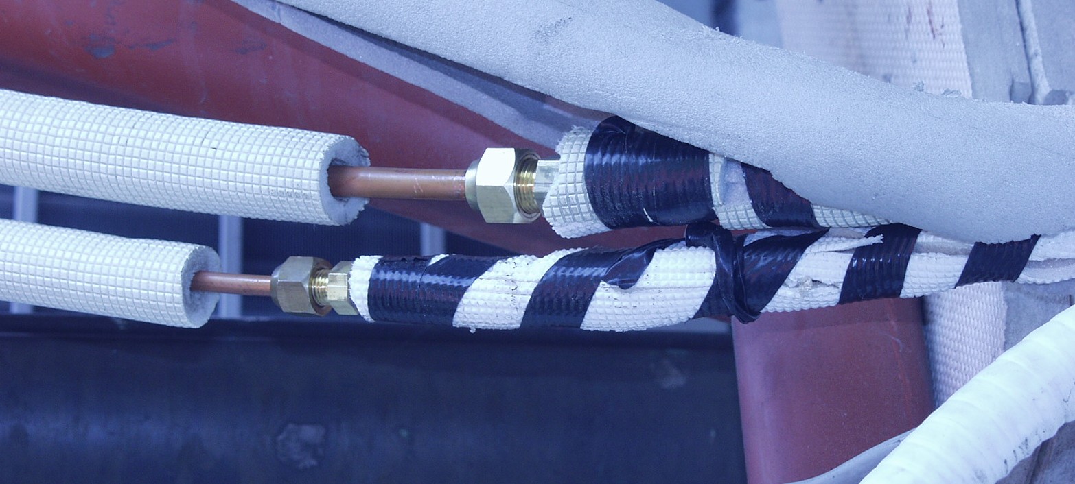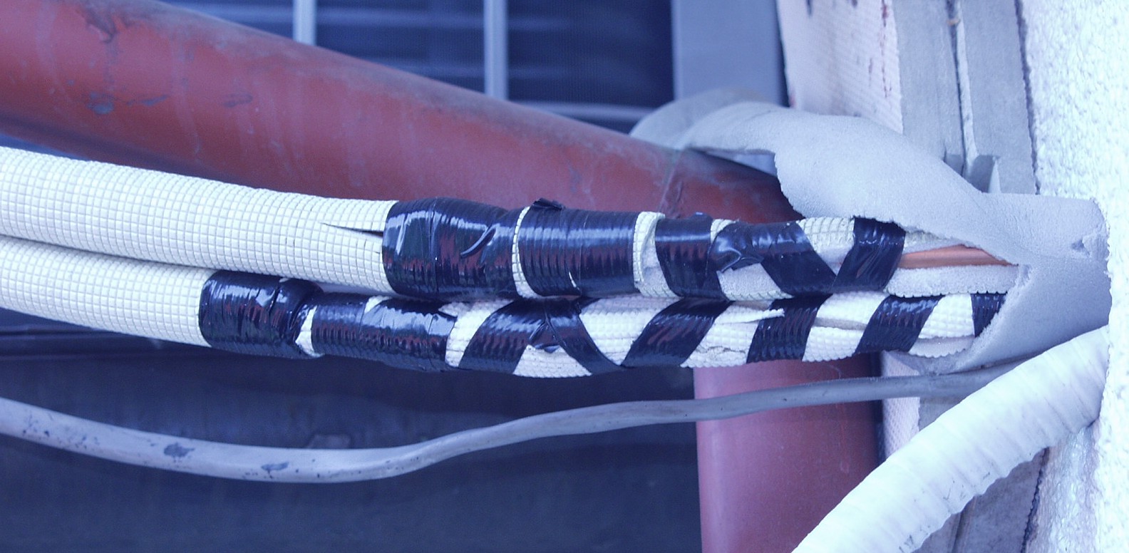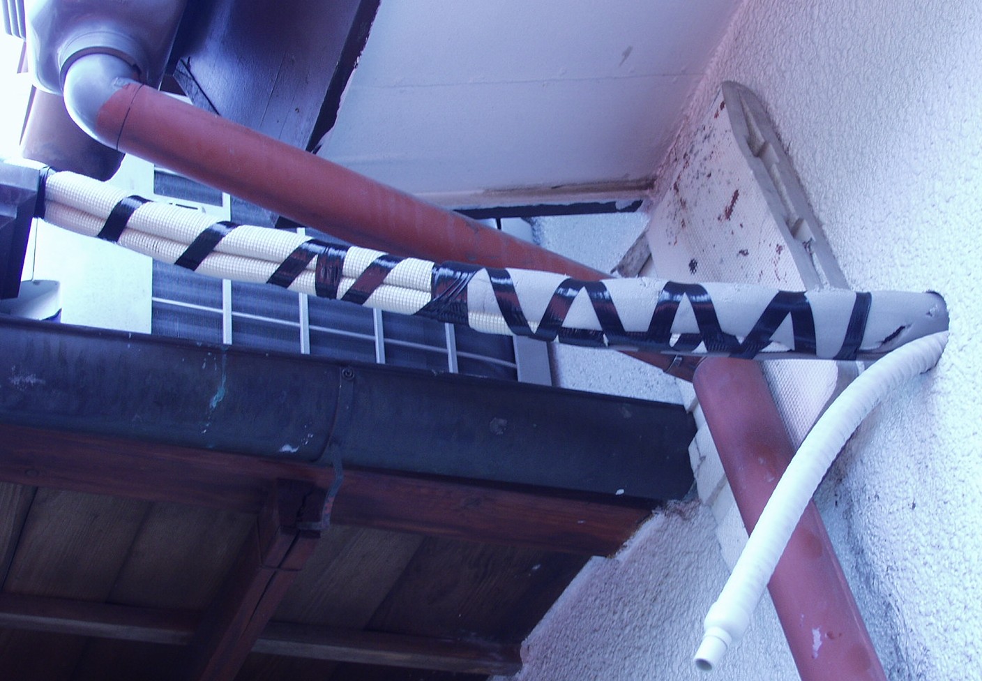 33.室外機側の配管の様子 頭の(エフコ)・テープは折って巻く