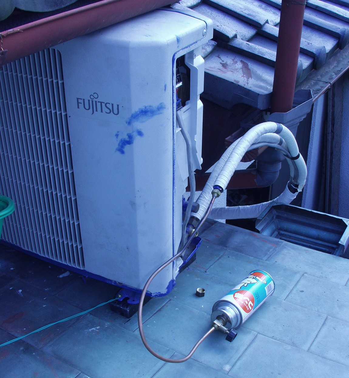 34.エアー・パージ。 卓上コンロ用のブタン・ガスで十分行い、フロンガスの流出を出来るだけ無くす