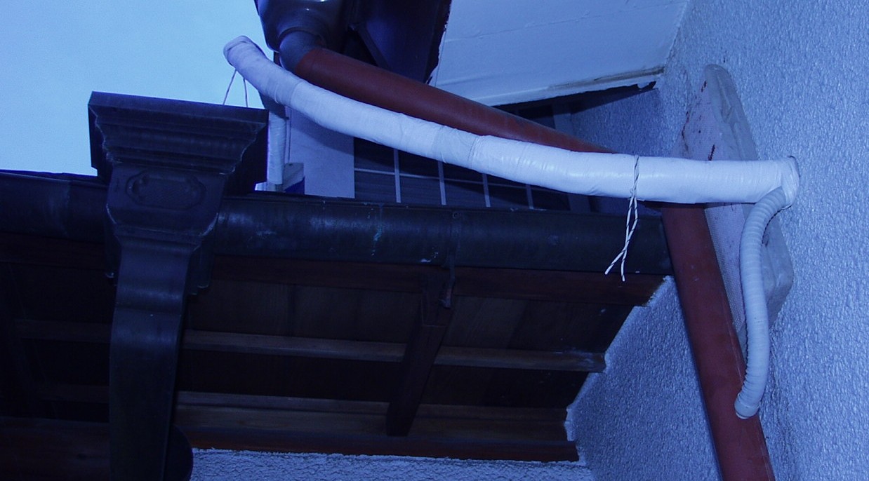 25.ドレインの配管は雨樋にジョイント 壁穴へのコンパウンドは後で入れる(在庫が見つからない)