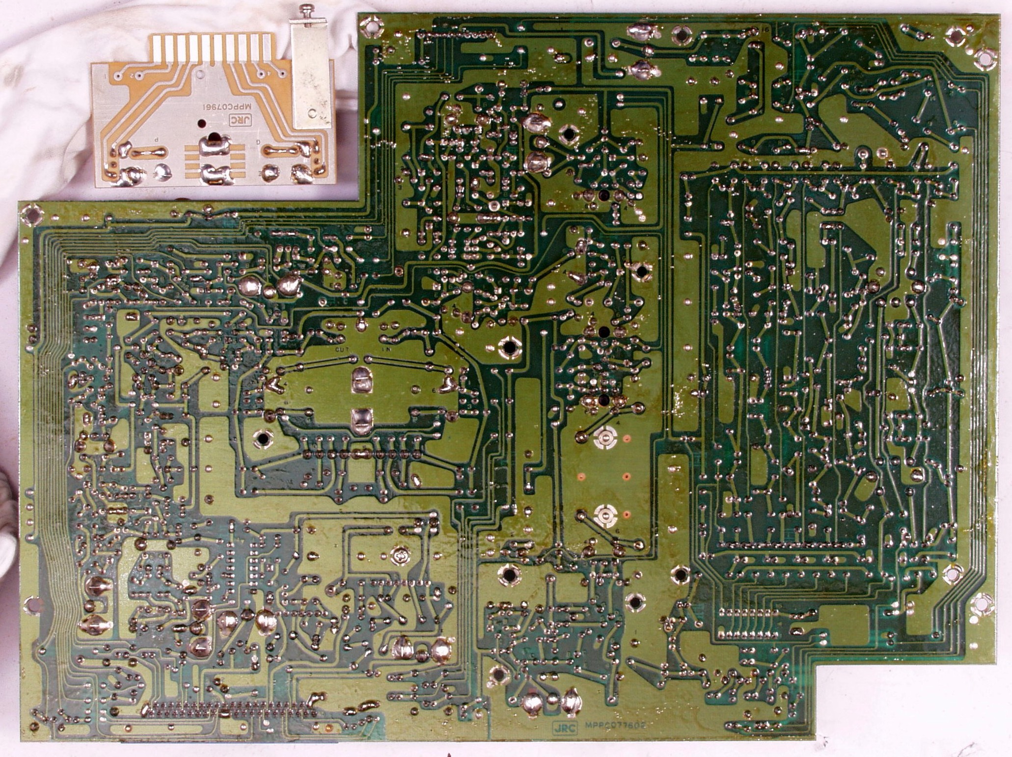 | C−6E. 修理中 シンセサイザー基板裏、シールドを外した所 |
