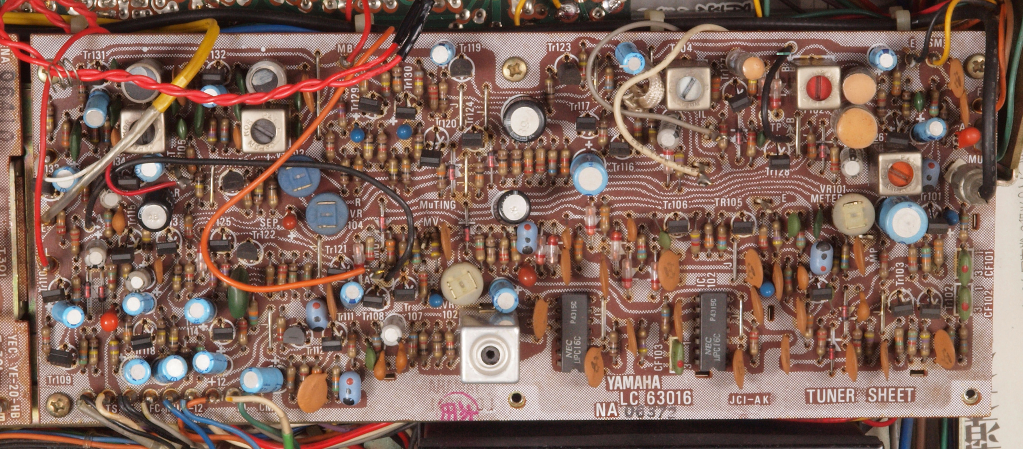 | C72. 修理後 FM受信基板。 電解コンデンサー個27、全TR(トランジスター)、半固定VR4個、フイルムコンデンサー個交換 | ||||||||||||||||||||||||||||||||||||||||||||||||||||||||||||||||||||||||||||||||||||||||||||||||||||||