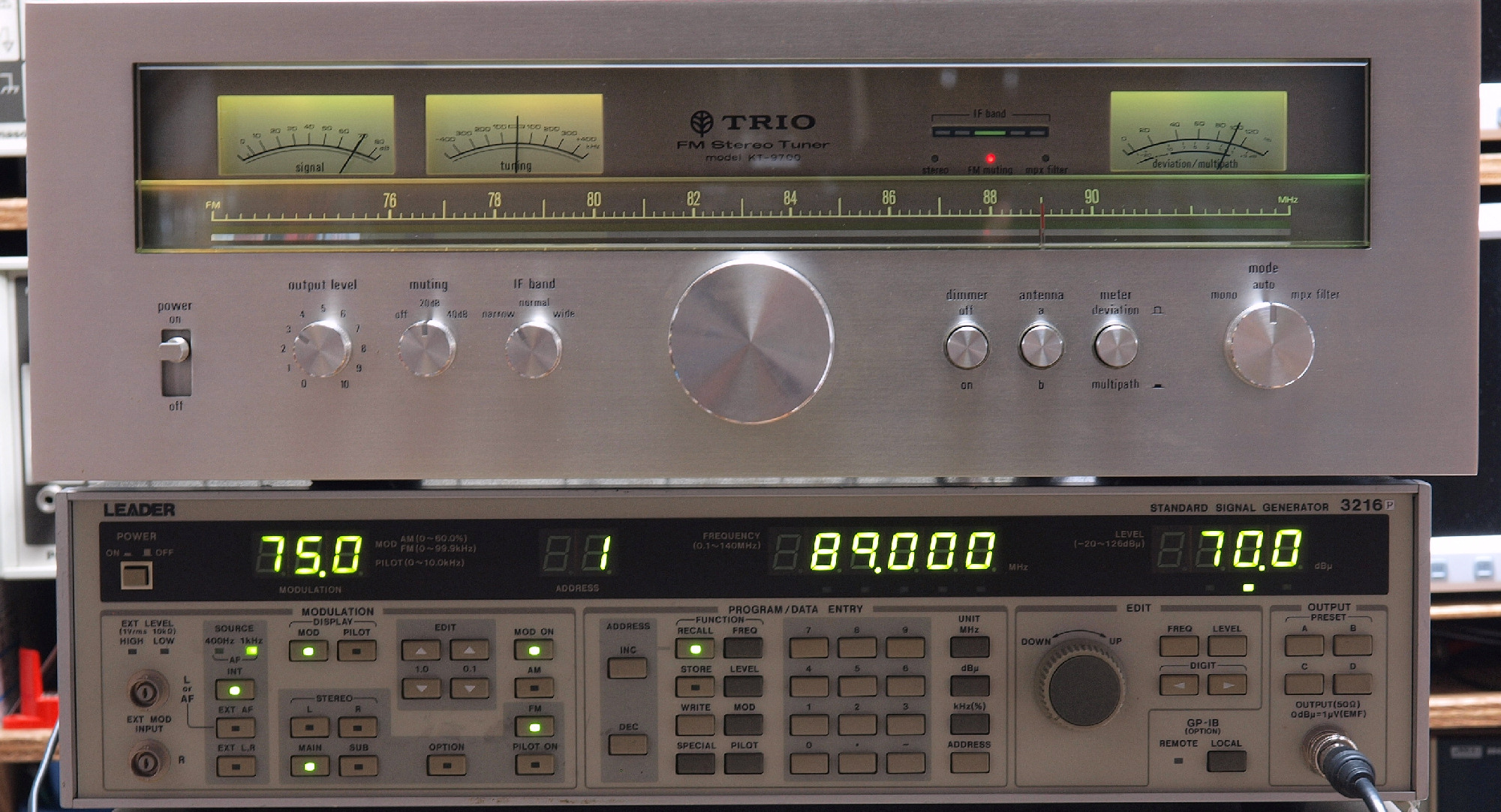 | E. 調整・測定、 「FM受信感度、RL分離測定、周波数調整」. <見方> 中上の「LEADER 3216P FM ステレオ信号発信器」より信号を出す。 これを受信し出力を測定する。 表示LED、 左端=変調度、 中左=メモリNo、 中右=出力周波数、 右端=出力レベル。 中下=R出力測定。 「Audio Analyzer Panasonic VP−7723B」より測定。 表示LED、 左端=メモリーNo、 中左=周波数測定、 中右=出力電圧測定、 右端=歪み率測定。 下=L出力測定。 「Audio Analyzer Panasonic VP−7723B」より測定。 表示LED、 左端=メモリーNo、 中左=周波数測定、 中右=出力電圧測定、 右端=歪み率測定。 |