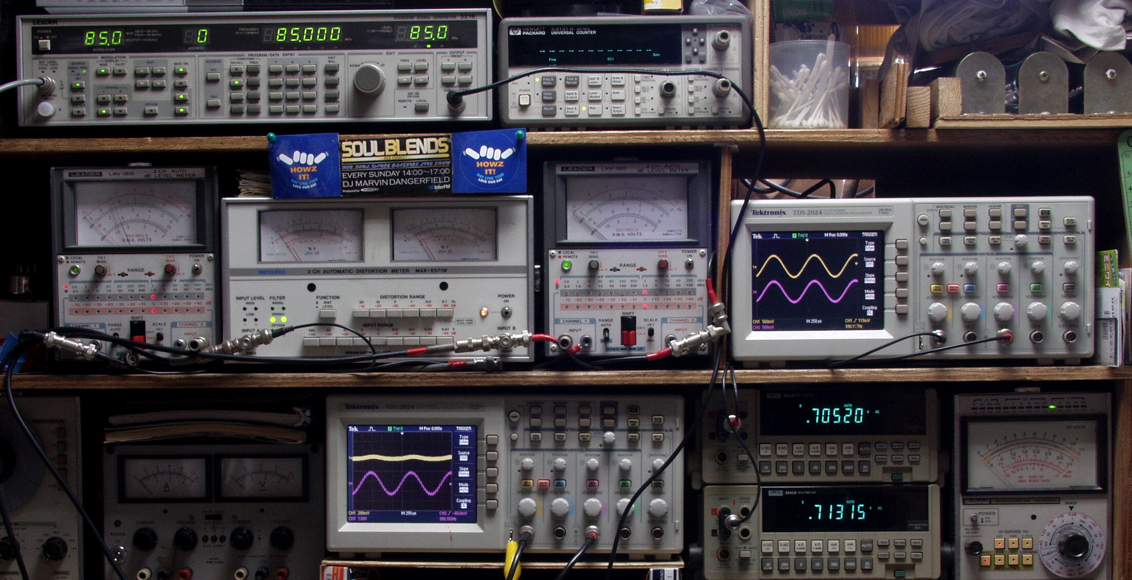| E. 調整・測定 FM受信感度、RL分離測定調整 <見方> 上のFMステレオ信号発信器より 85MHZで 400HZ & 1KHZの 変調信号を 85dBで出す これを受信し出力を測定する。 中左端電圧計=L側出力電圧測定、黒針のみ使用。 中中左歪み率計=出力の歪み率測定 左メータ=L出力、右メータ=R出力。 中中右=R側出力電圧測定、赤針のみ使用。 中右端オシロ=出力波形 赤色=R出力、黄色=L出力。 下中=オシロ=H&V出力波形 上=H出力、下=V出力。 下中右上デジタル電圧計=出力電圧測定R、下中右下デジタル電圧計=出力電圧測定L。 |