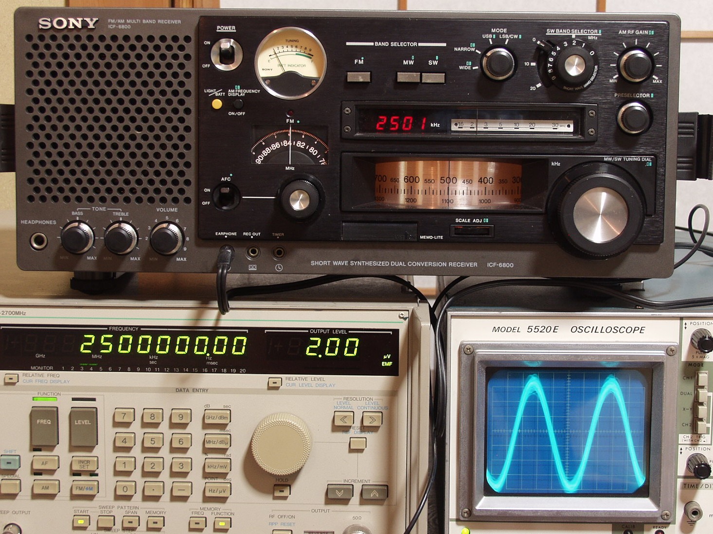 | E.調整・測定 下のSSGより29.5MHZのキャリヤに400HZを50%変調かけて2μVを受信 SP出力を左のオシロで見る 以下、SW測定は周波数の変更のみで測定 プロの受信機測定は此方 アマチュア機器の測定は此方 |
