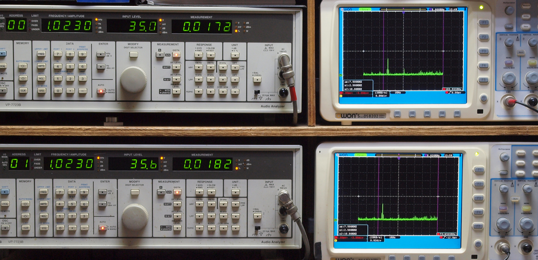 | E. 調整・測定。 画像をクリックすると、大きく(横幅2050ドット)表示されます。 E1. 出力・歪み率測定・調整。 「見方」。 上段中 右側SP出力を「Audio Analyzer Panasonic VP−7723B」により測定。 表示LED、 左端=メモリーNo、 中左=周波数測定、 中右=出力電圧測定、 右端=歪み率測定。 上段右端 VP−7723Bの基本波除去出力を「owon SDS8202(200MHZ)」で「FFT分析」表示。 下段中 左側SP出力を「Audio Analyzer Panasonic VP−7723B」により測定。 表示LED、 左端=メモリーNo、 中左=周波数測定、 中右=出力電圧測定、 右端=歪み率測定。 下段右端 VP−7723Bの基本波除去出力を「owon SDS6062(200MHZ)」で「FFT分析」表示。 下段左端 オーディオ発振器 VP−7201A より50Hz〜100kHzの信号を出し(歪み率=約0.003%)、ATT+分配器を通し、AMPに入力。 よって、ダイアル設定出力レベルより低くなります。測定機器の仕様や整備の様子はこちら、「VP−7723B」「VP−7201A」。 FFT画面の見方はこちら。 |