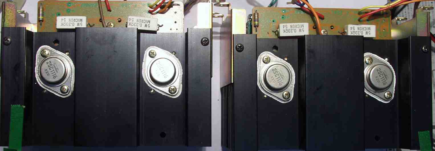 | A5. 修理前 交換してある終段抵抗、終段TR が綺麗なので交換してある。 これらの修理が施されたのは大事故の証拠 熱のため、流れだし、全くないシリコン・グリス 終段終段TR(トランジスター)が元気だと良いですが? |