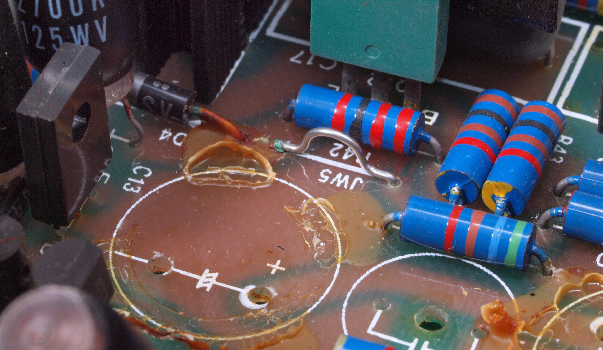 C212. 修理中 L側電源基板、 電解コンデンサー固定用の接着材、当時は溶媒にトルエンが使用されており、銅を腐食する。