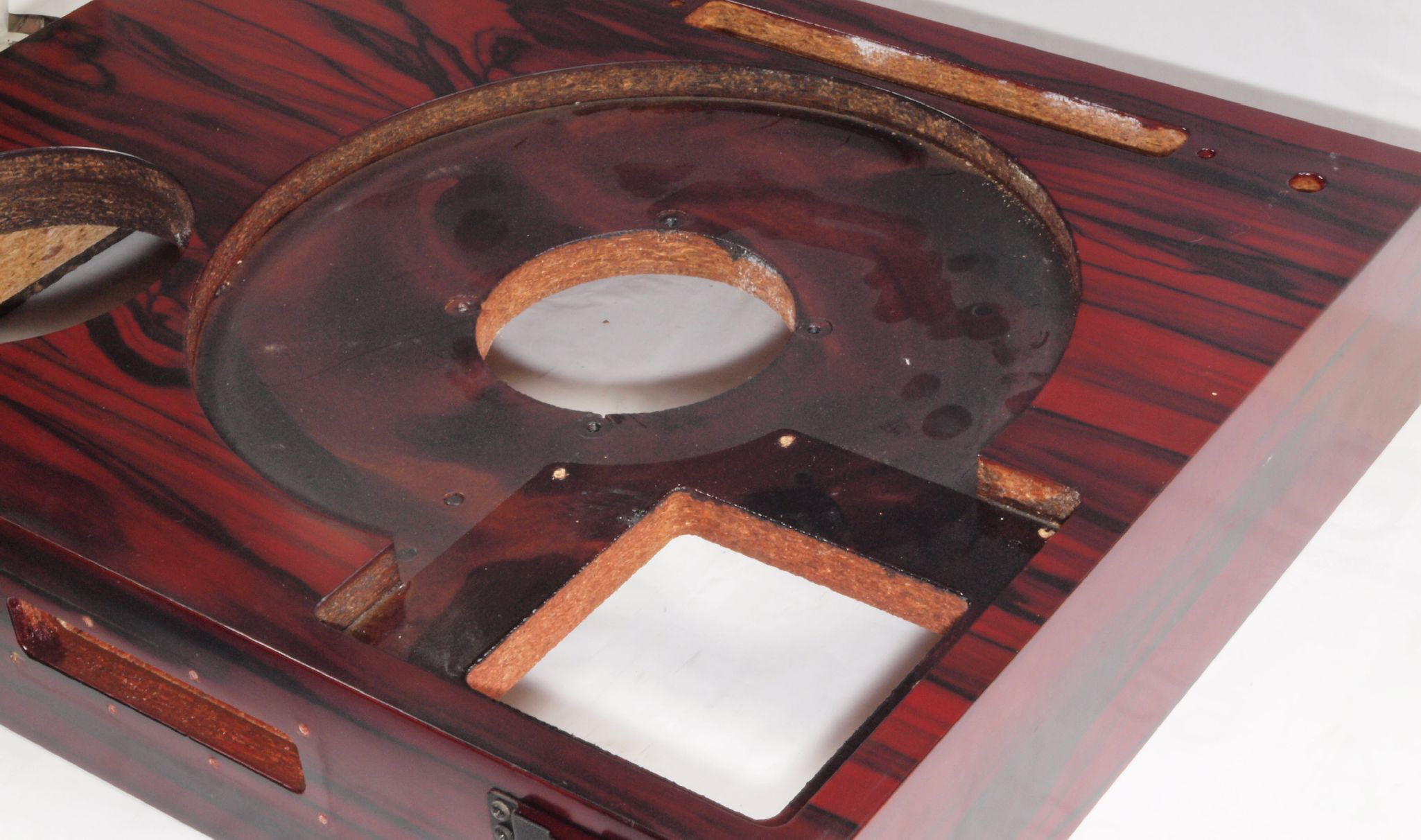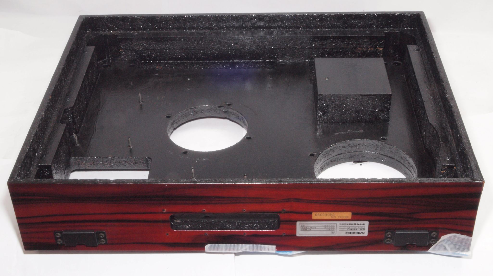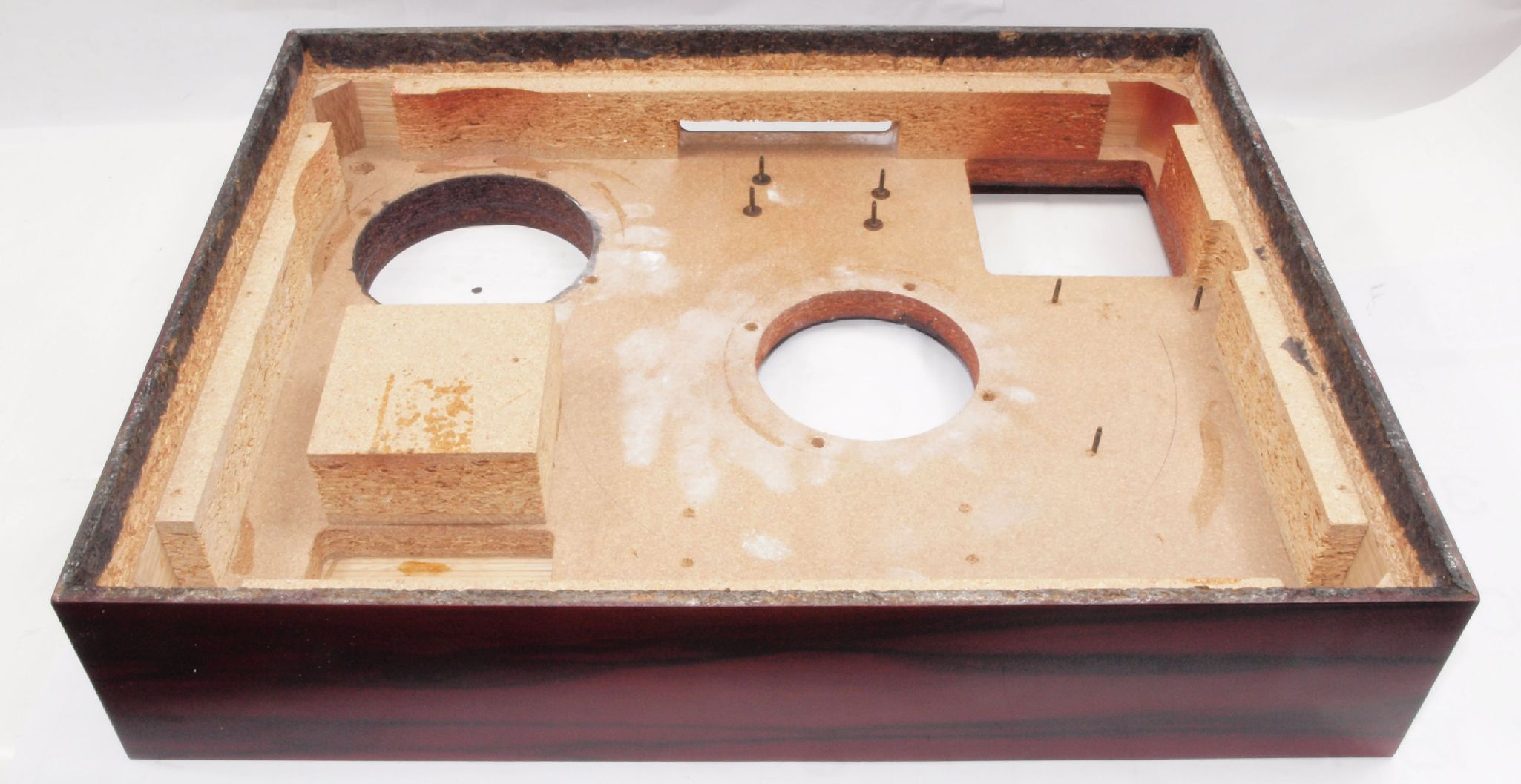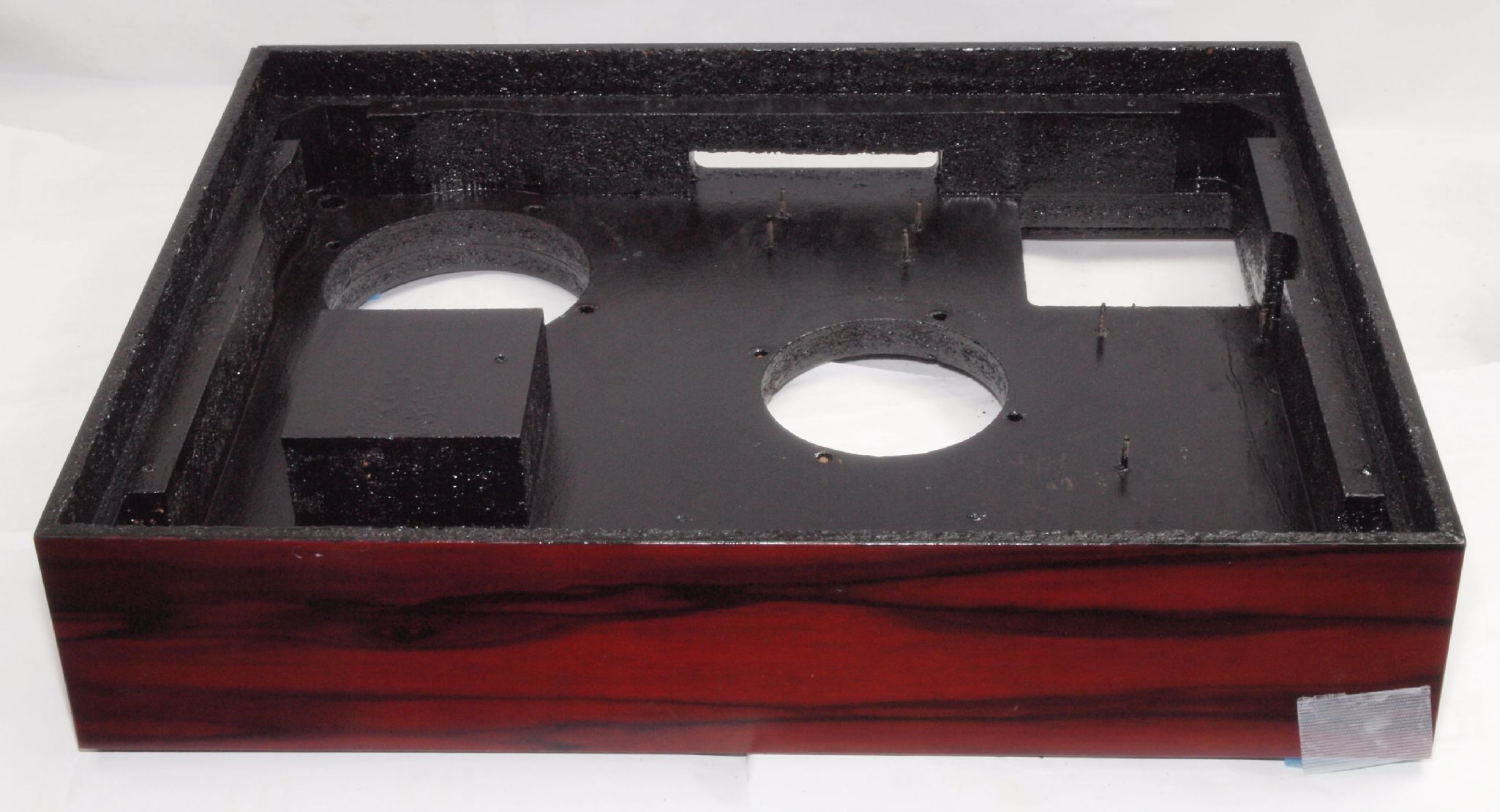 | W. 下蓋及び本体木部 修理状況。 画像をクリックすると、大きく(横幅2050ドット)表示されます。 W1. 修理前 タンテーブル軸ユニット、アーム取付一体シャーシを外した本体。 |