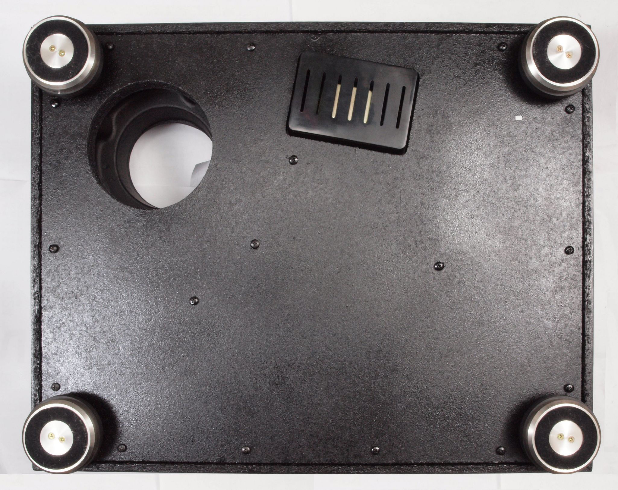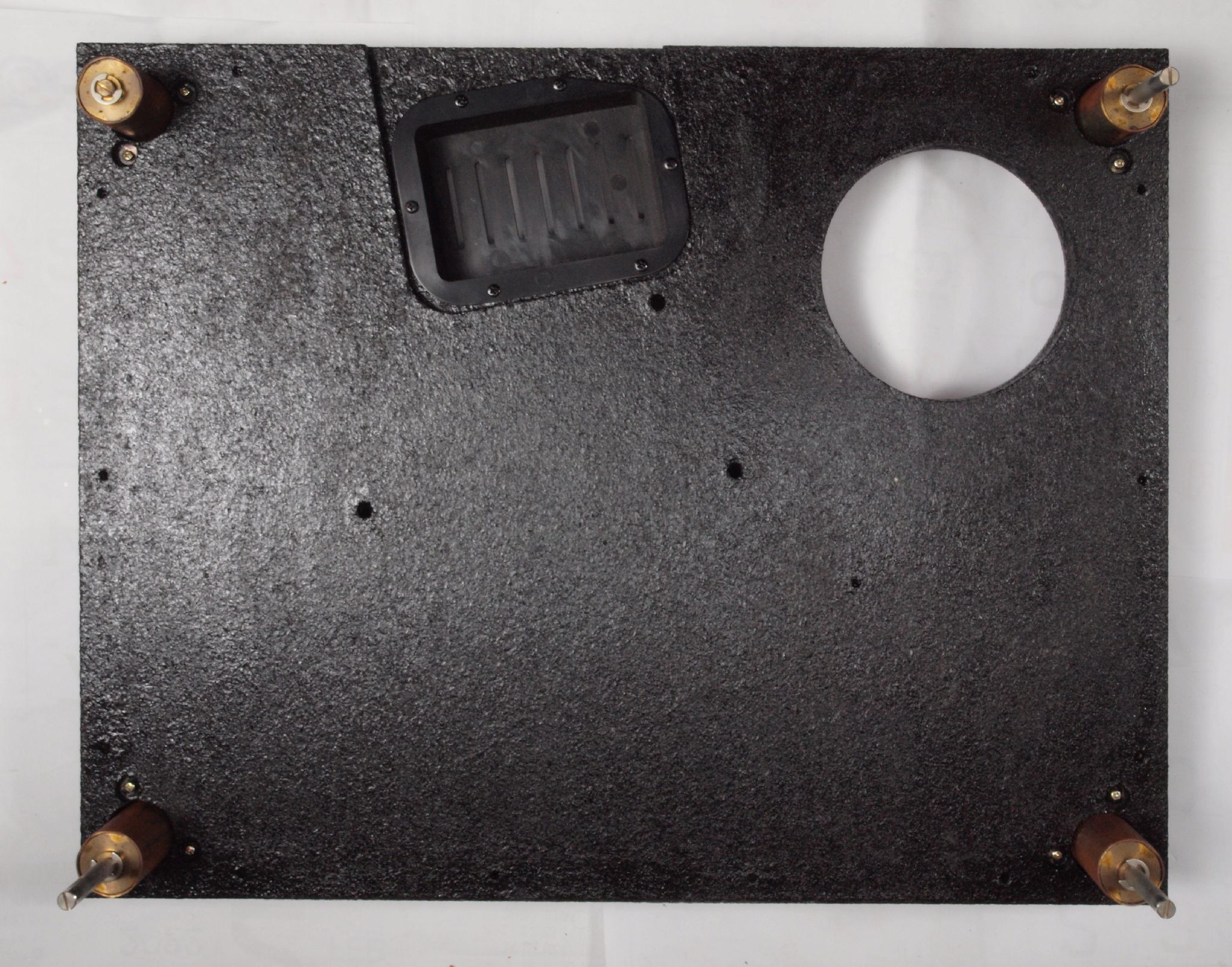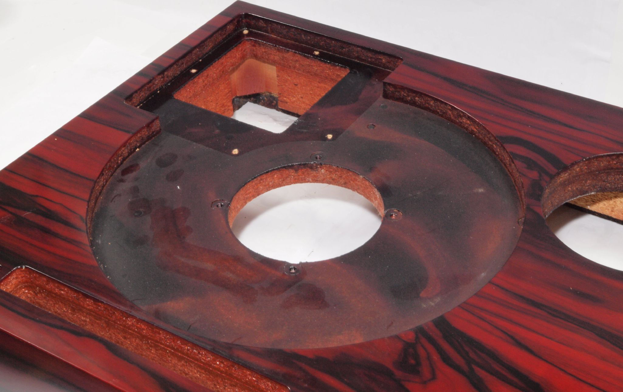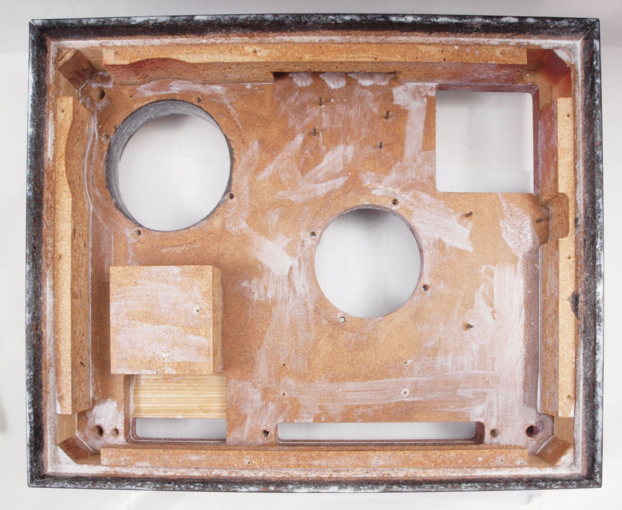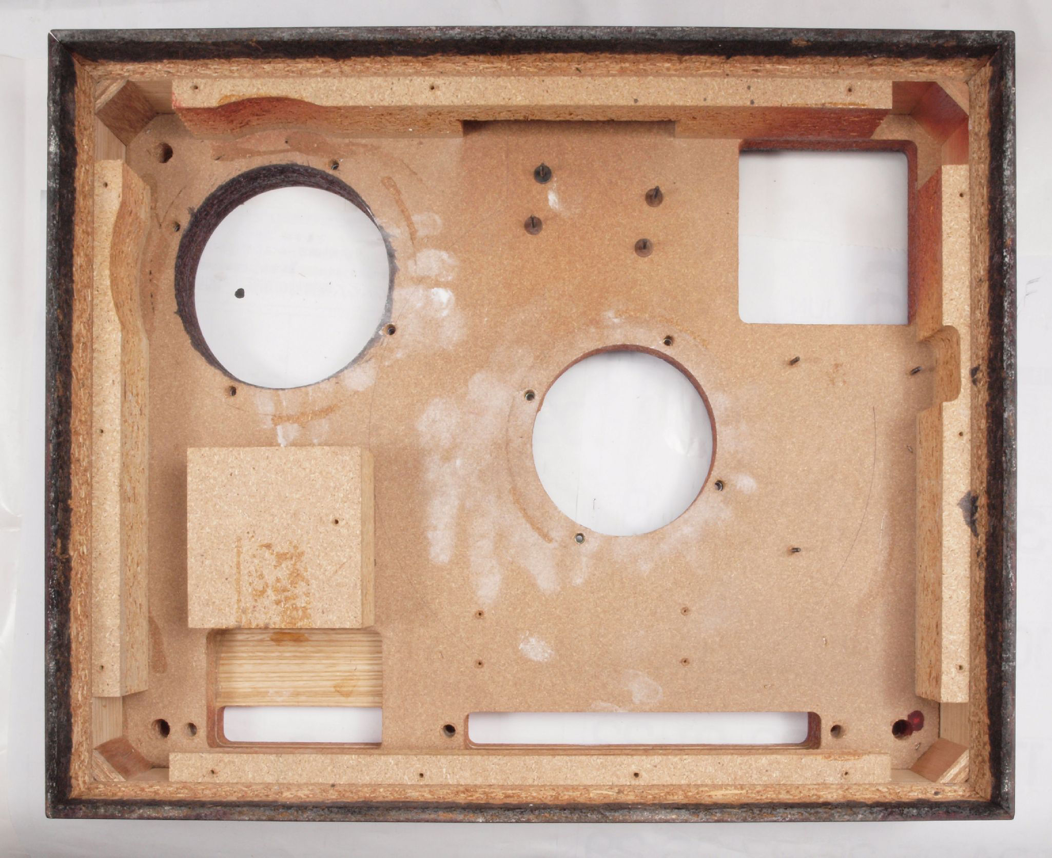 | W. 下蓋及び本体木部 修理状況。 画像をクリックすると、大きく(横幅2050ドット)表示されます。 W1. 修理前 タンテーブル軸ユニット、アーム取付一体シャーシを外した本体。 |