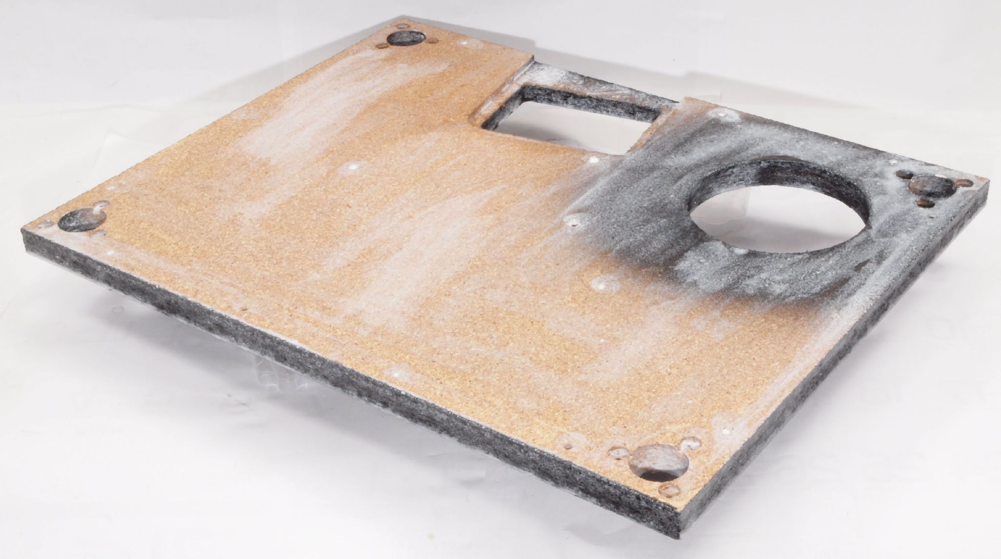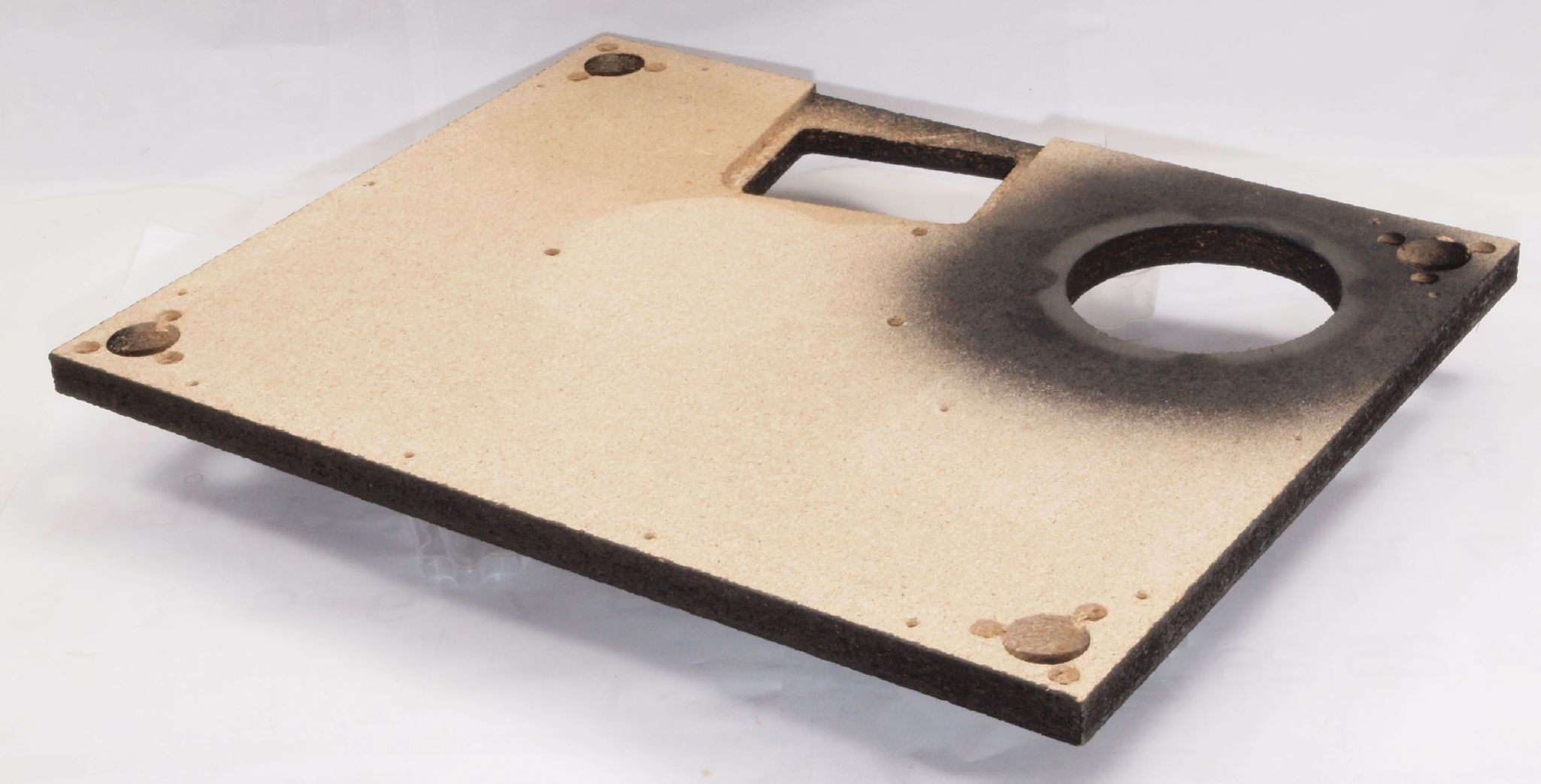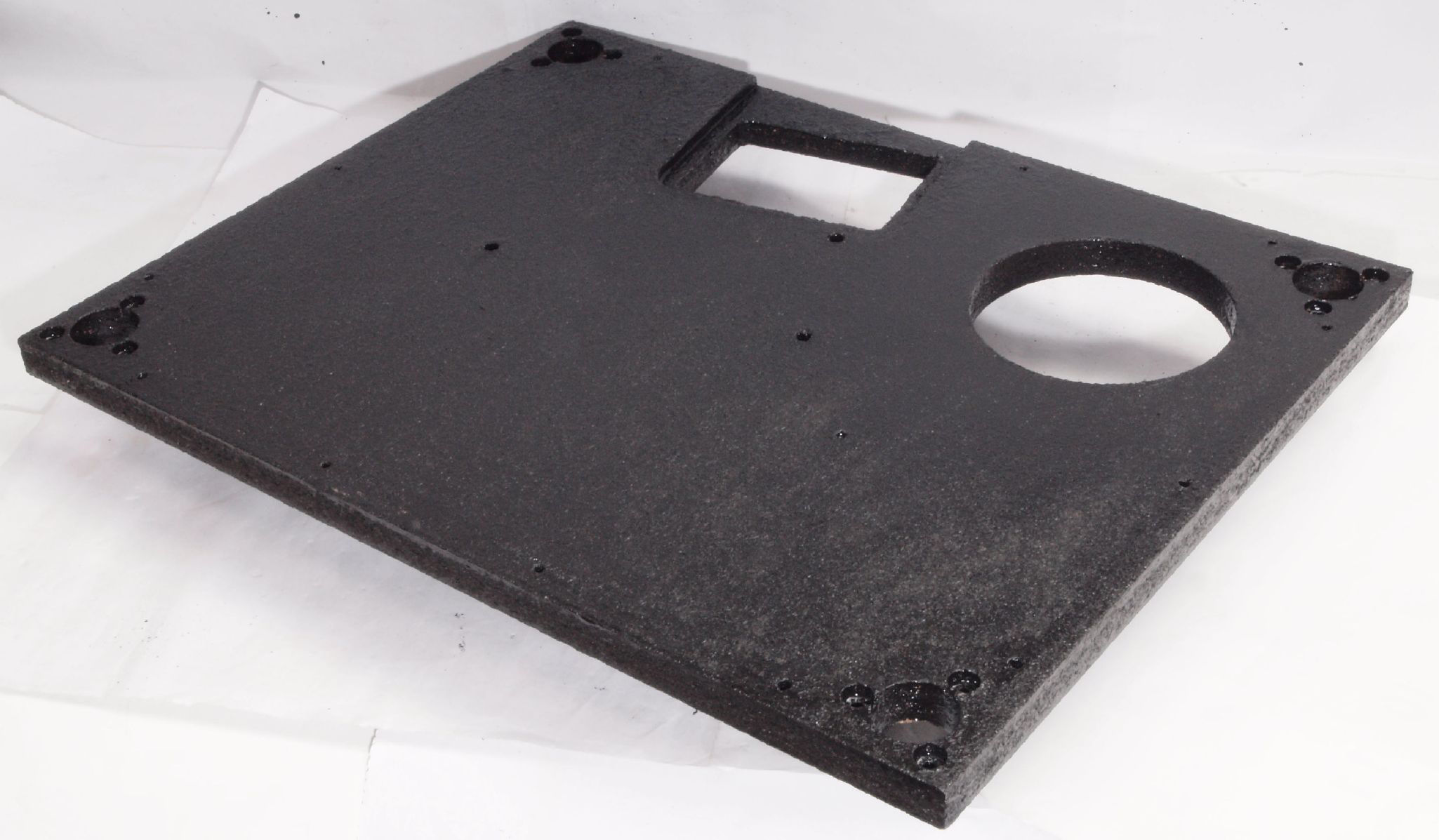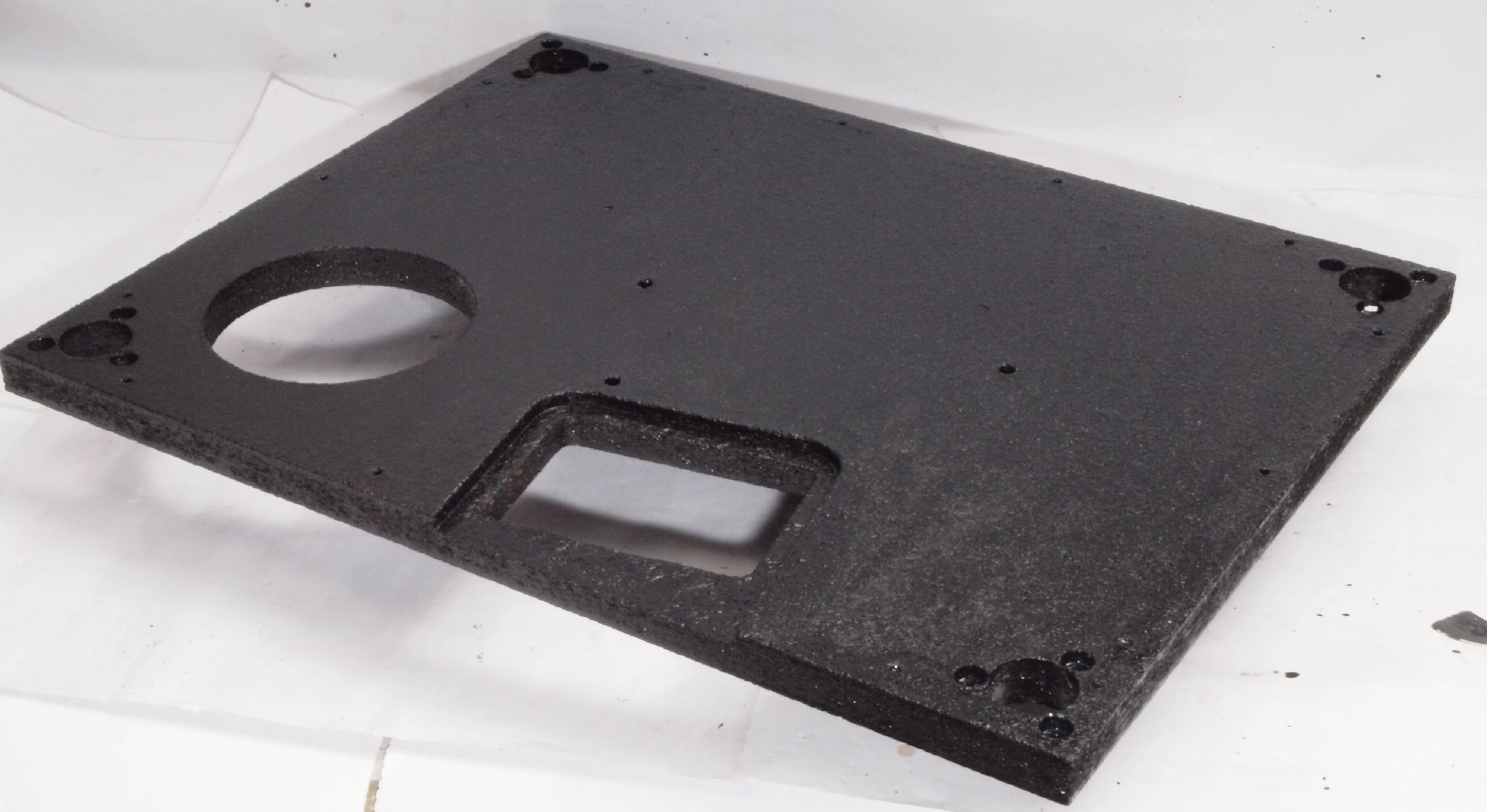 | W. 下蓋及び本体木部 修理状況。 画像をクリックすると、大きく(横幅2050ドット)表示されます。 W1. 修理前 タンテーブル軸ユニット、アーム取付一体シャーシを外した本体。 |