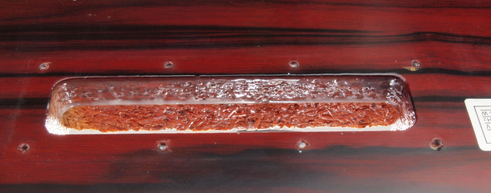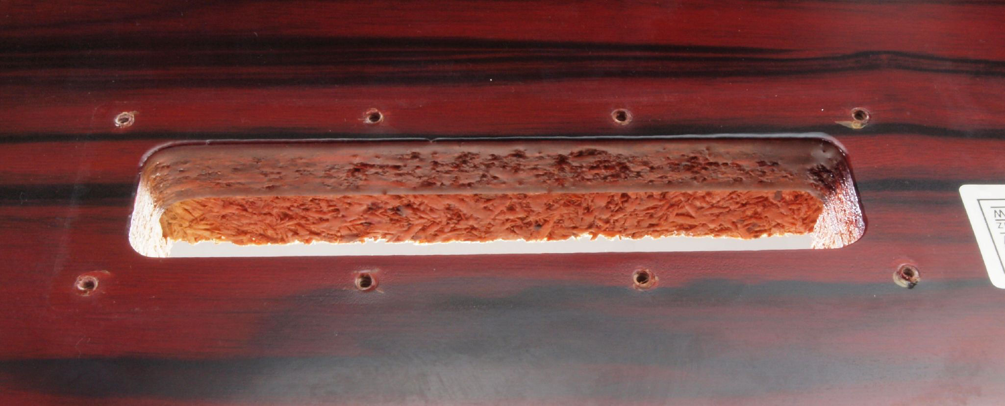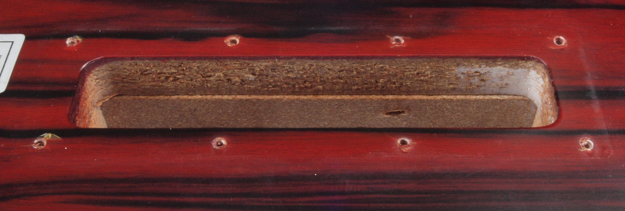| W72. 修理(塗装)後 底板裏側、 前右から。 圧縮材に、水性木工ボンドを塗布。 | ||||||||||||||||||||