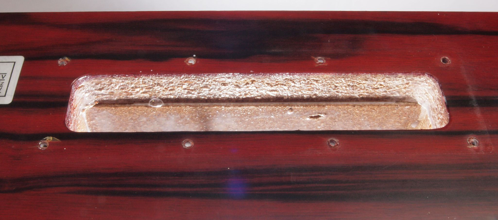 | W75. 修理中 底板裏側、 後左から。 圧縮材に、水性木工ボンドを塗布する。 | ||||||||||||||||||||