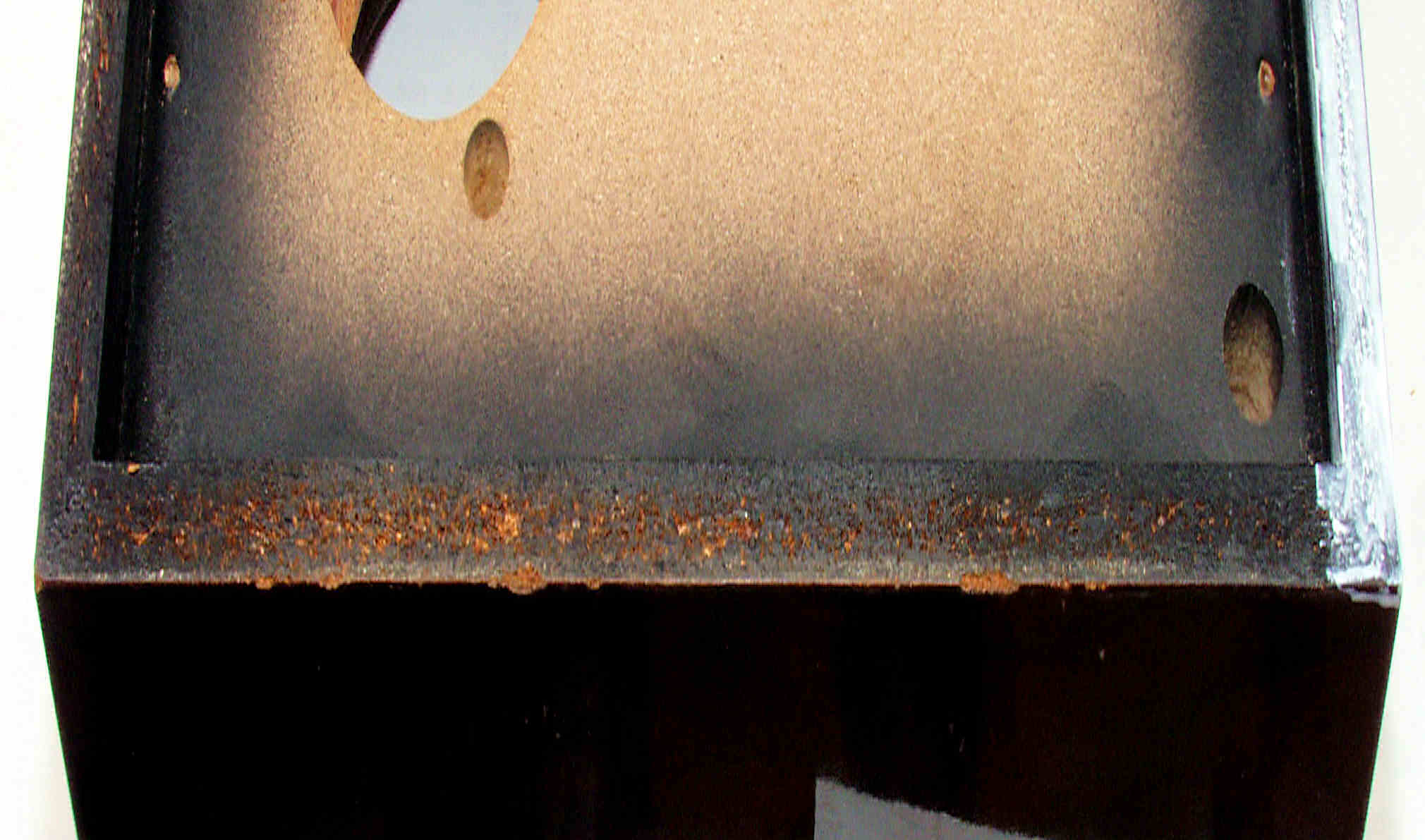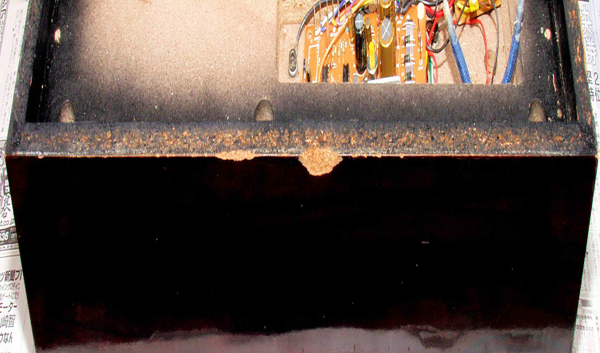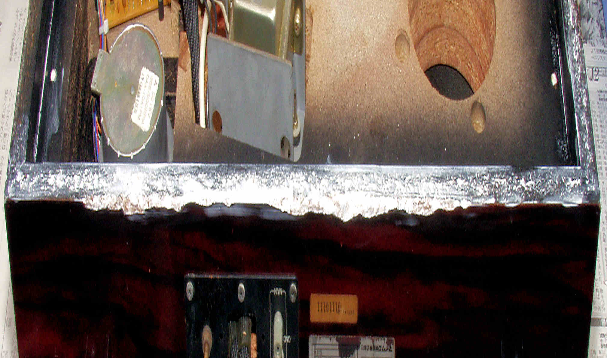 | M77. 修理中 外箱後下側拡大、水性木工ボンドを塗布乾燥 | ||||||||||||||||||||||||