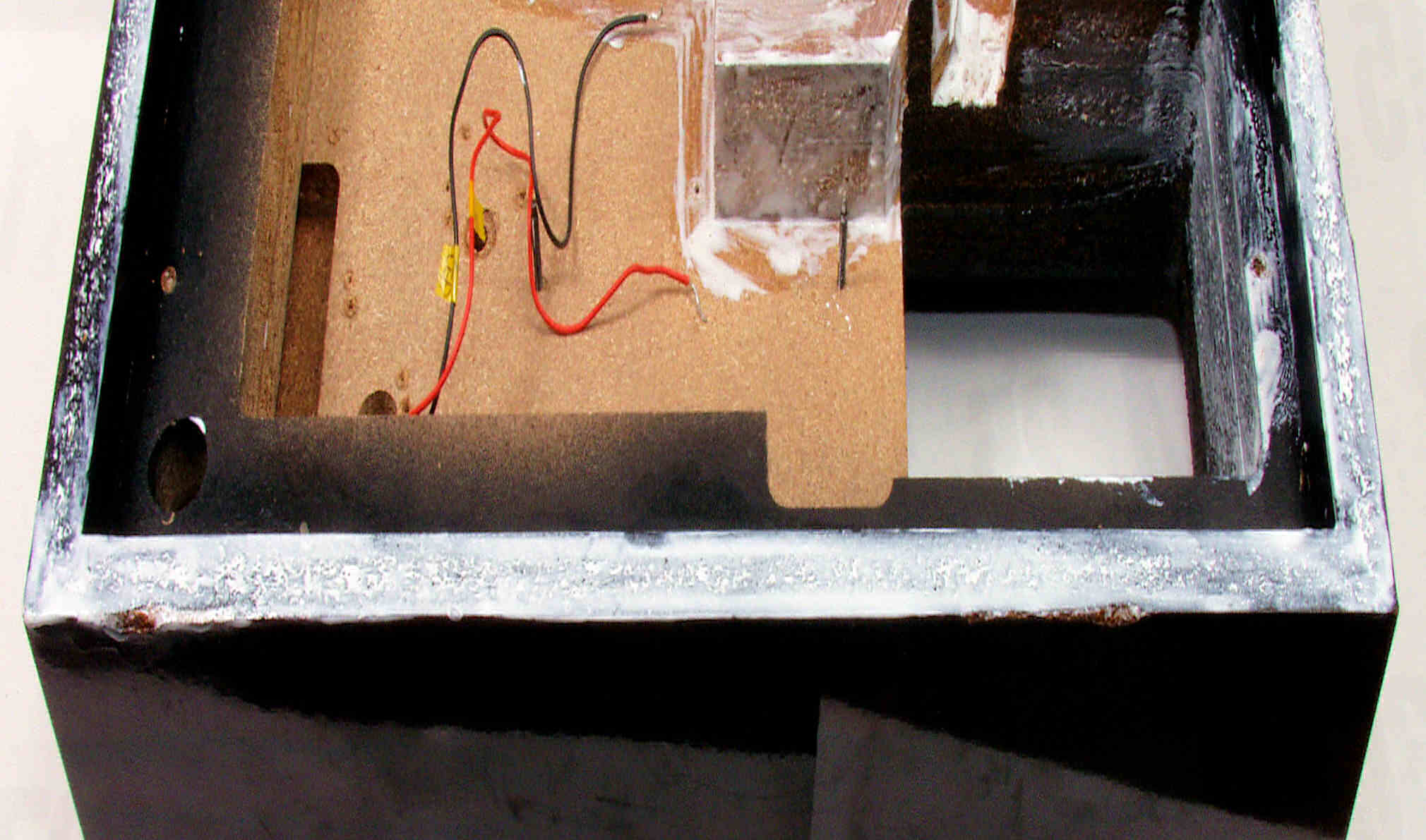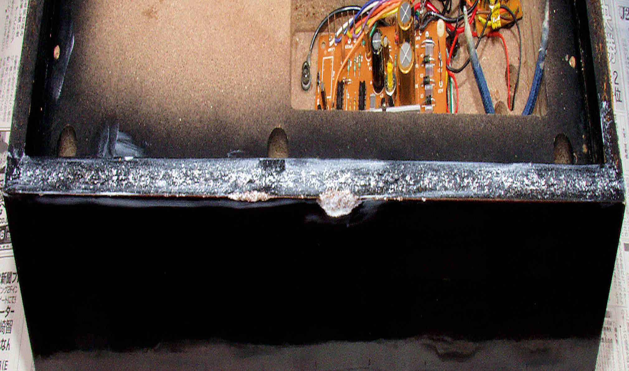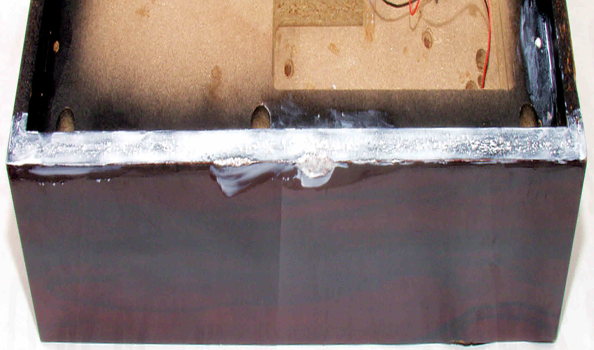 | M75. 修理中 外箱後下側、水性木工ボンドを塗布乾燥 | ||||||||||||||||||||||||