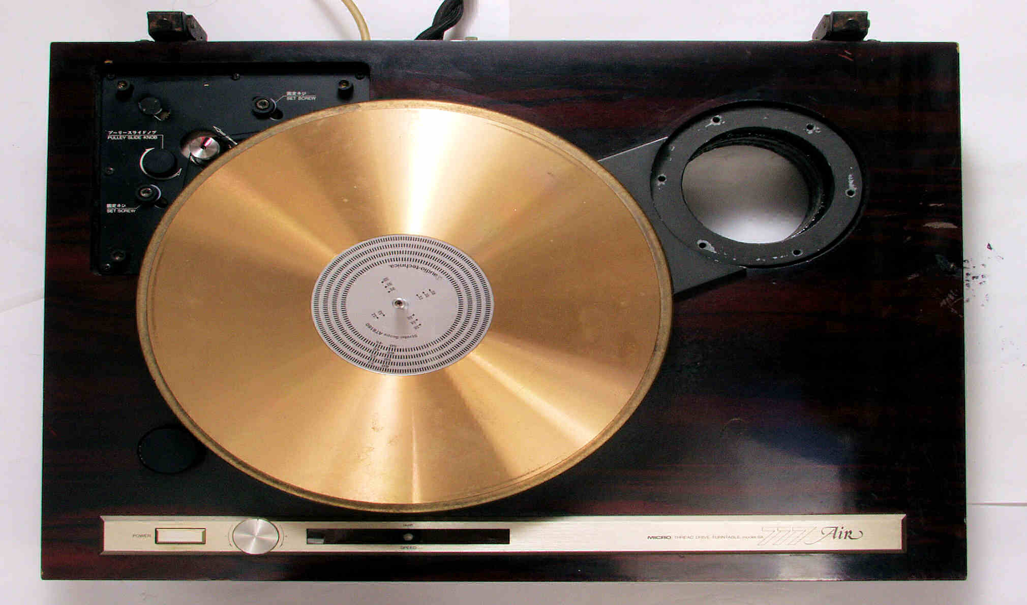 | M42. 修理中 取り外したタンテーブル本体+アーム固定台裏。この後軸オイル交換する | ||||||||||||||||||||||||
