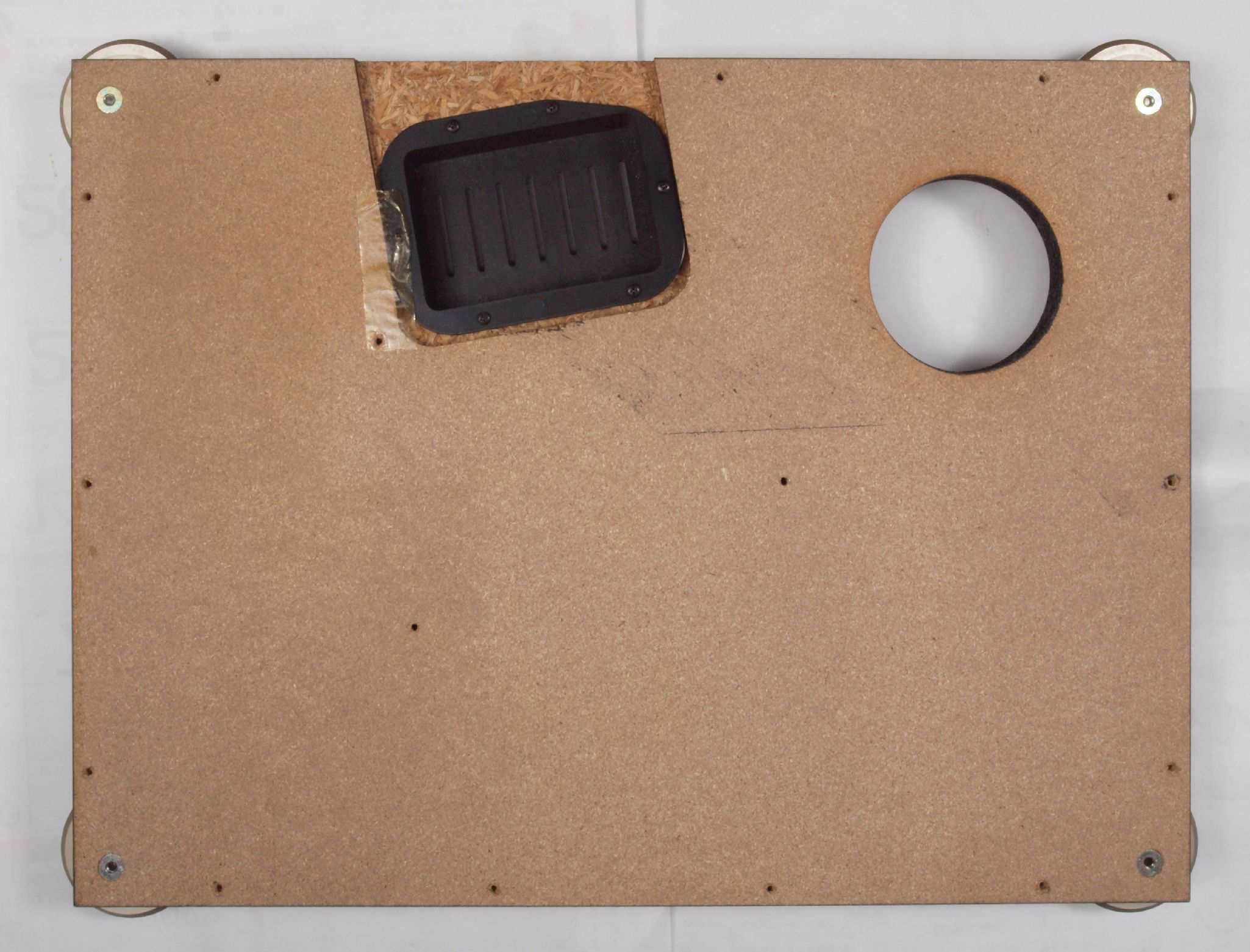 | W35. 修理中 本体木枠下後右。 圧縮材にボンドを染みこませる、ネジ穴も塗る。 | ||||||||||||||||||||||||