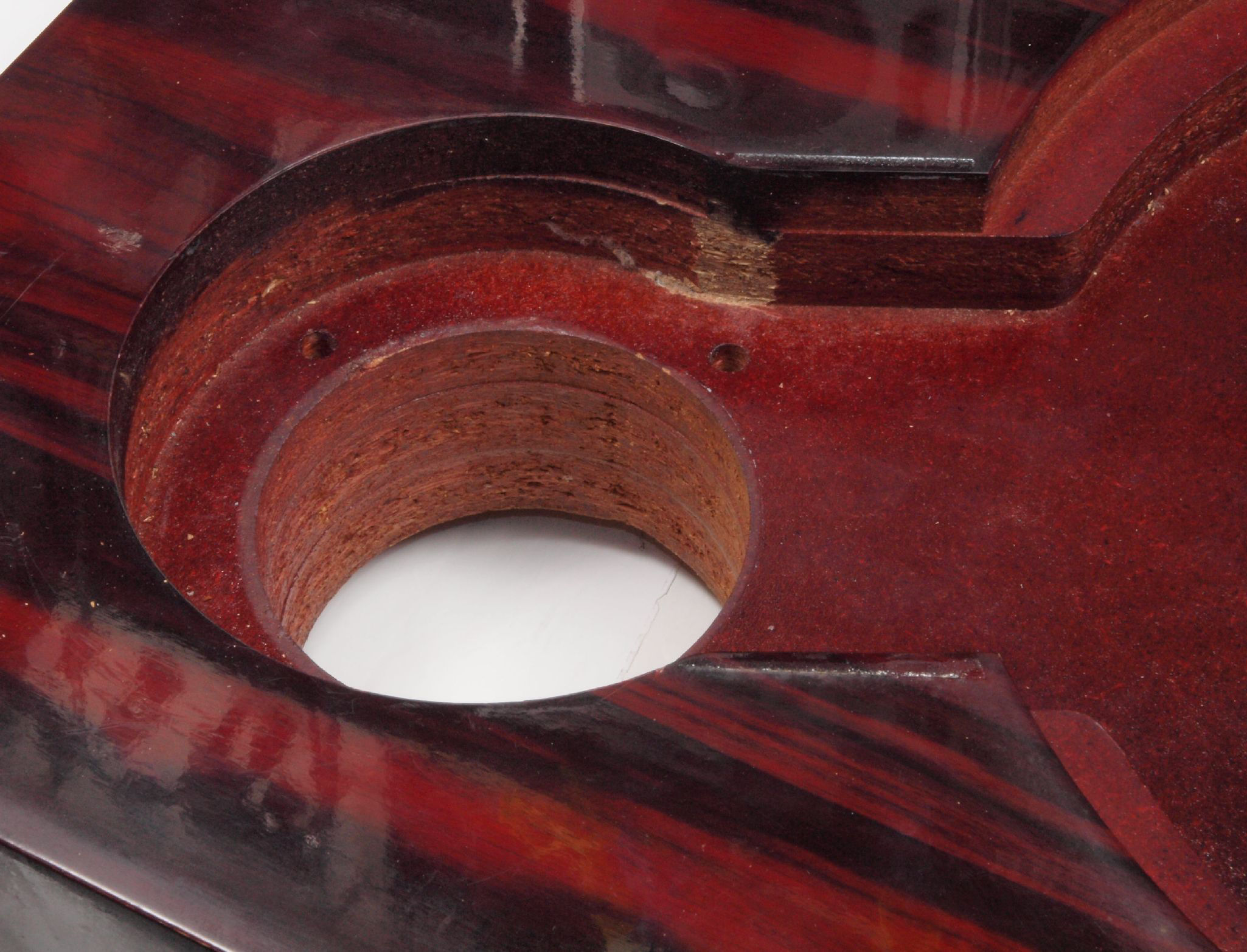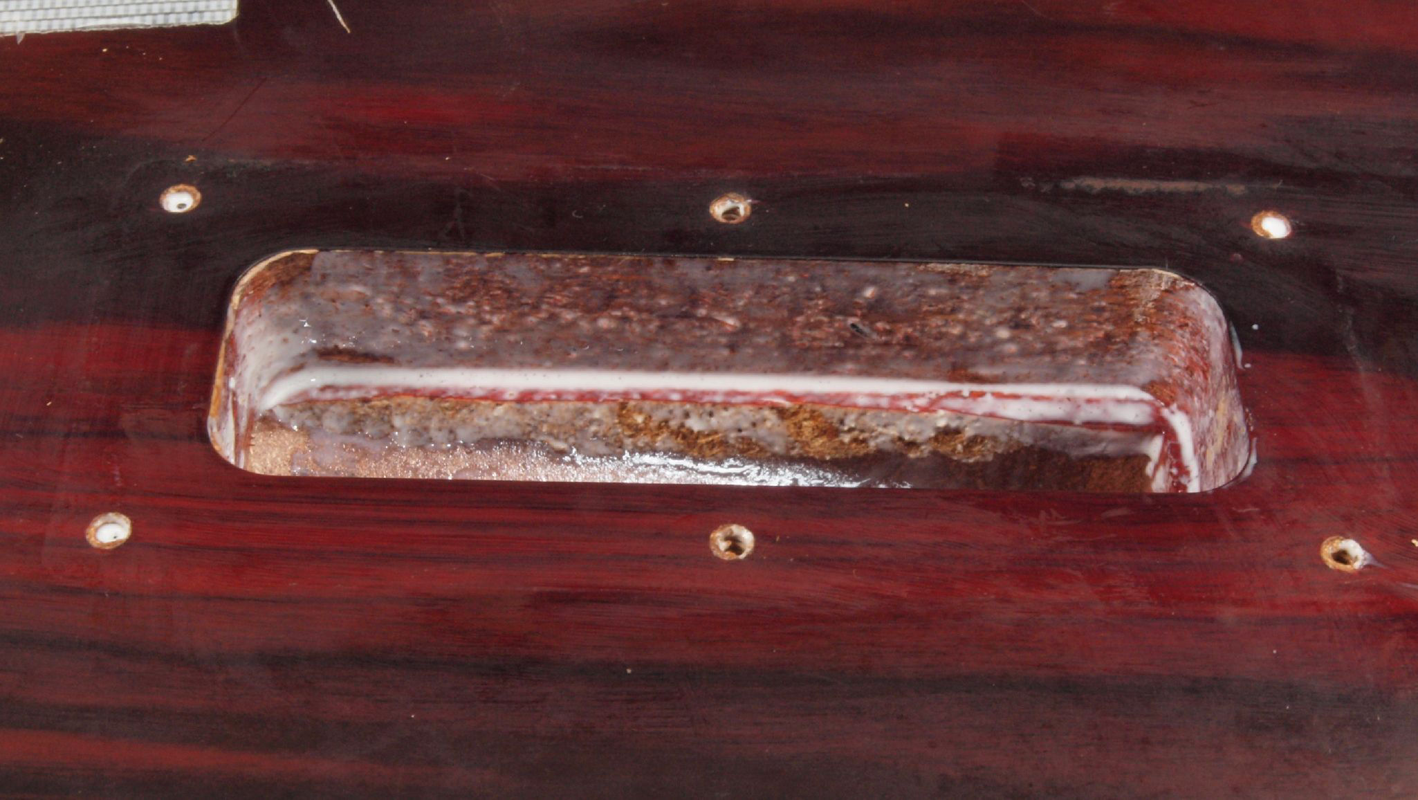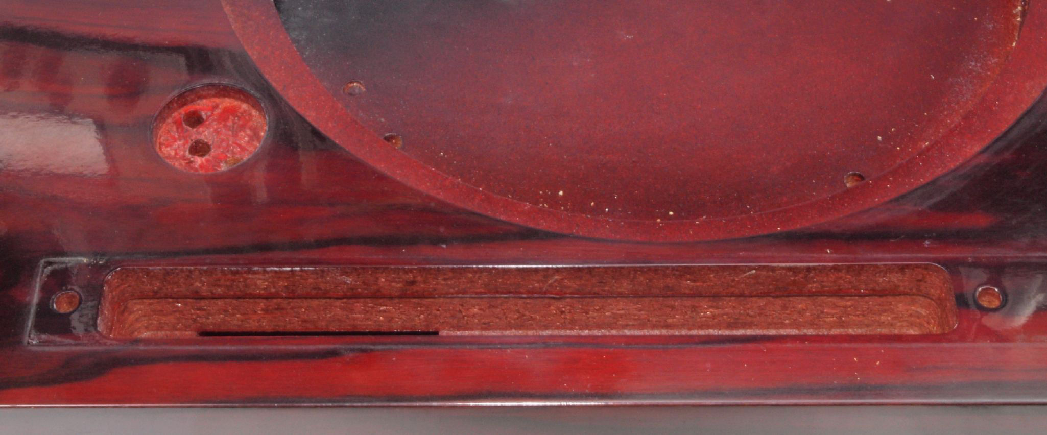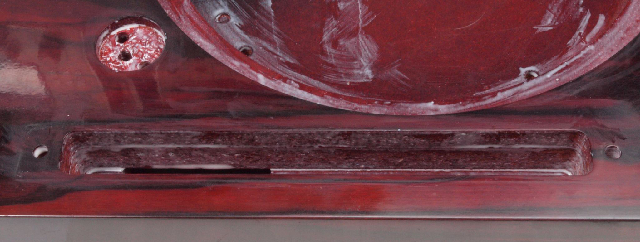 | W7B. 修理中 下蓋のトランスカバー取り付穴、反対側。ボンドを染みこませる、ネジ穴も塗る。 | ||||||||||||||||||||||||