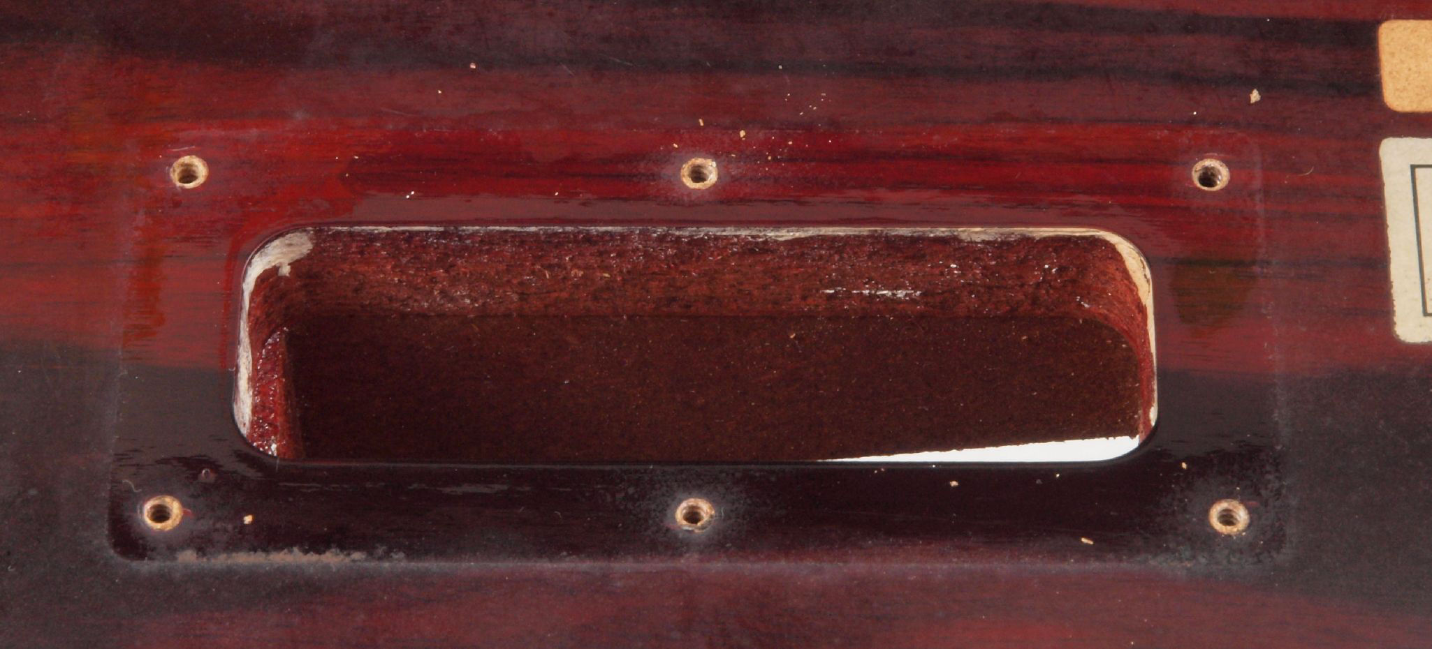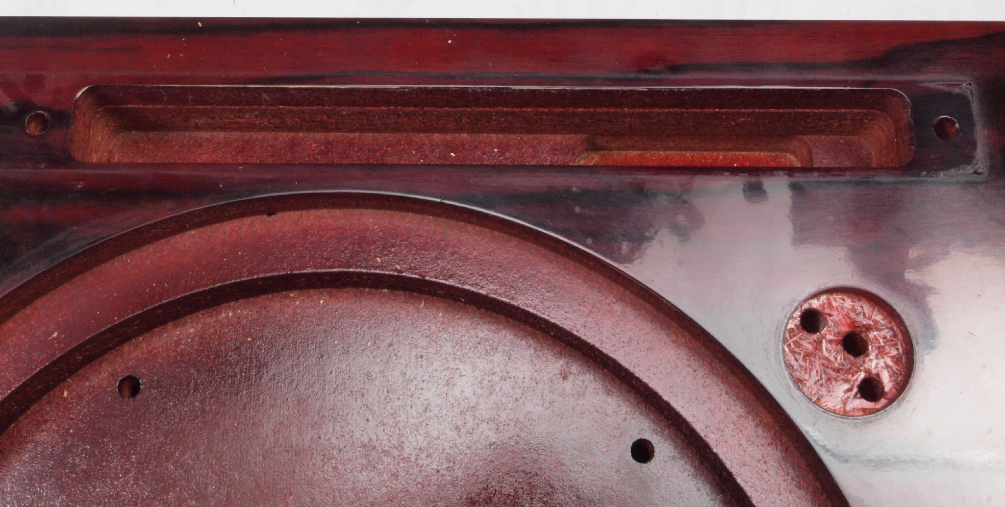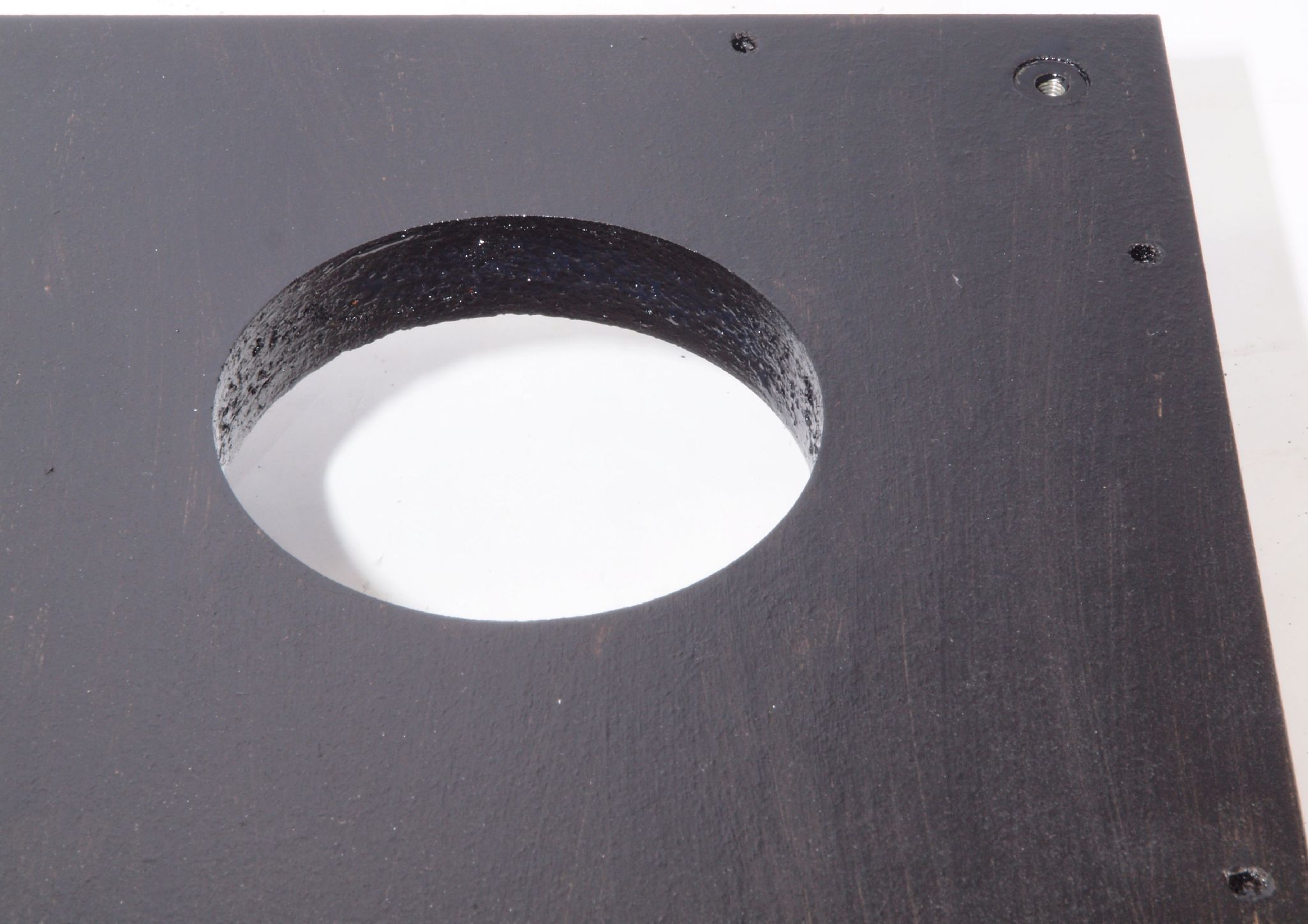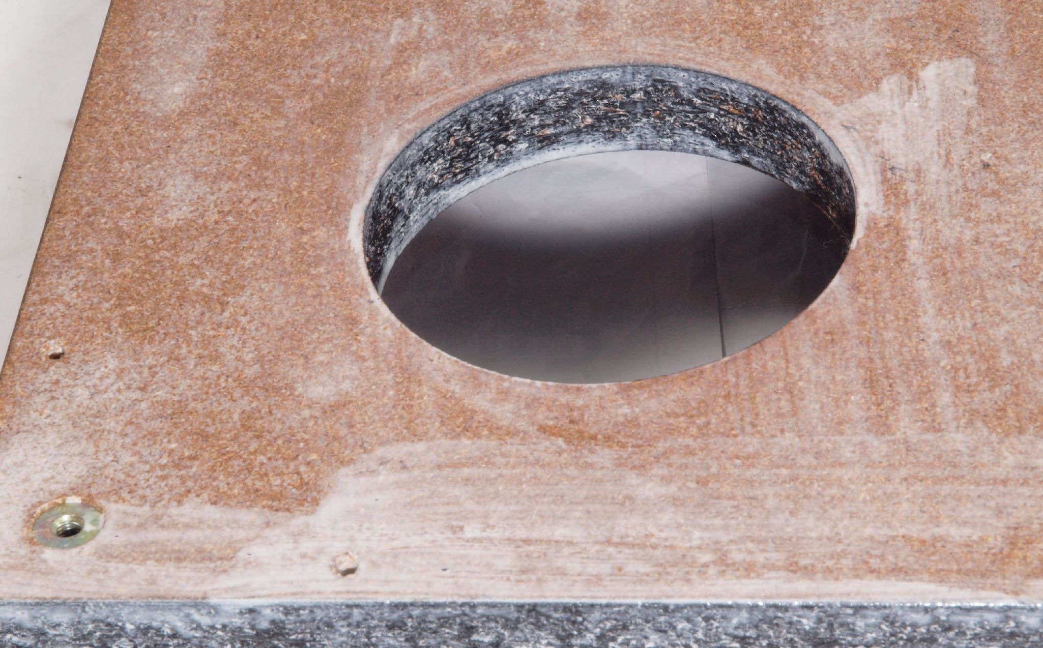 | W7B. 修理中 下蓋のトランスカバー取り付穴、反対側。ボンドを染みこませる、ネジ穴も塗る。 | ||||||||||||||||||||||||