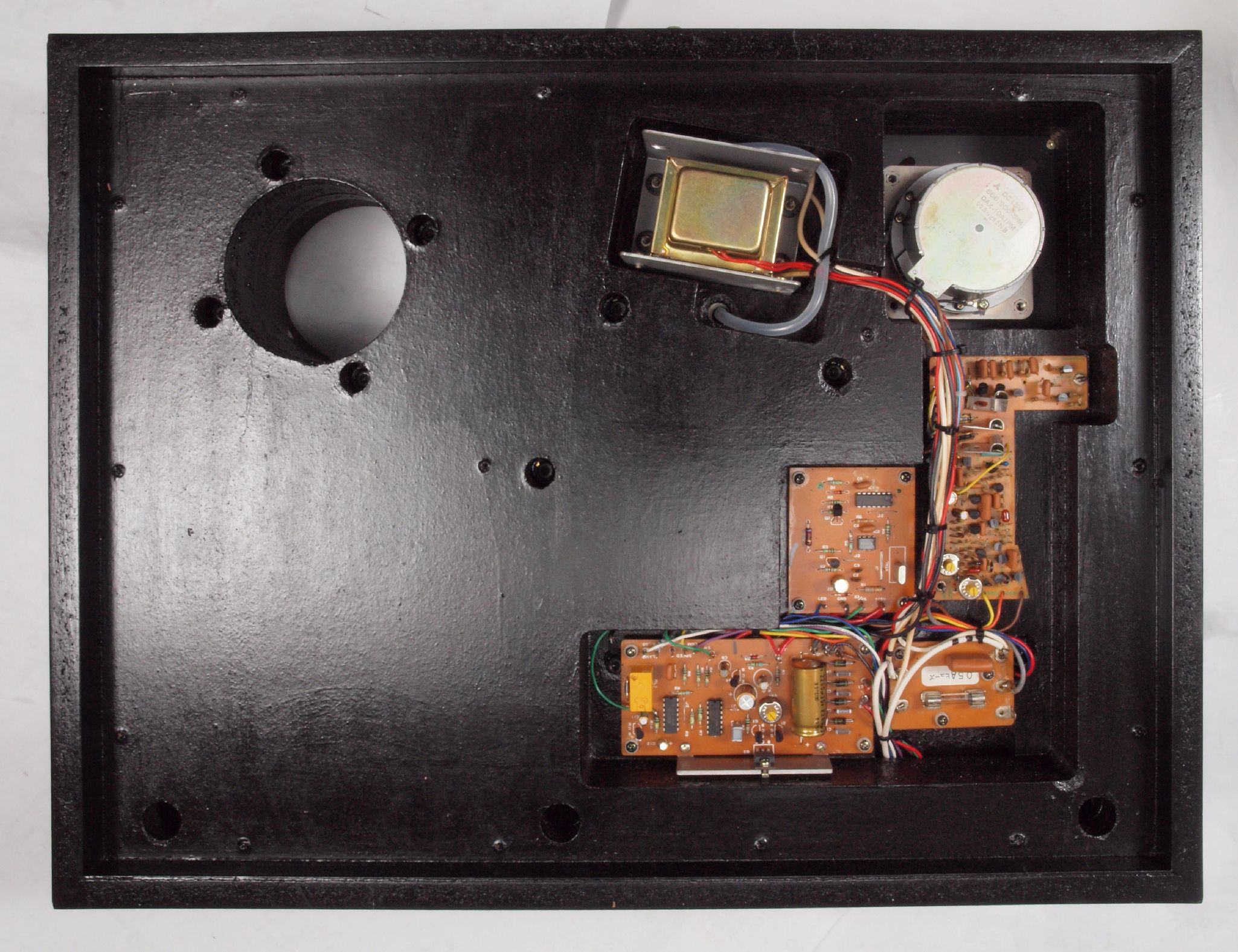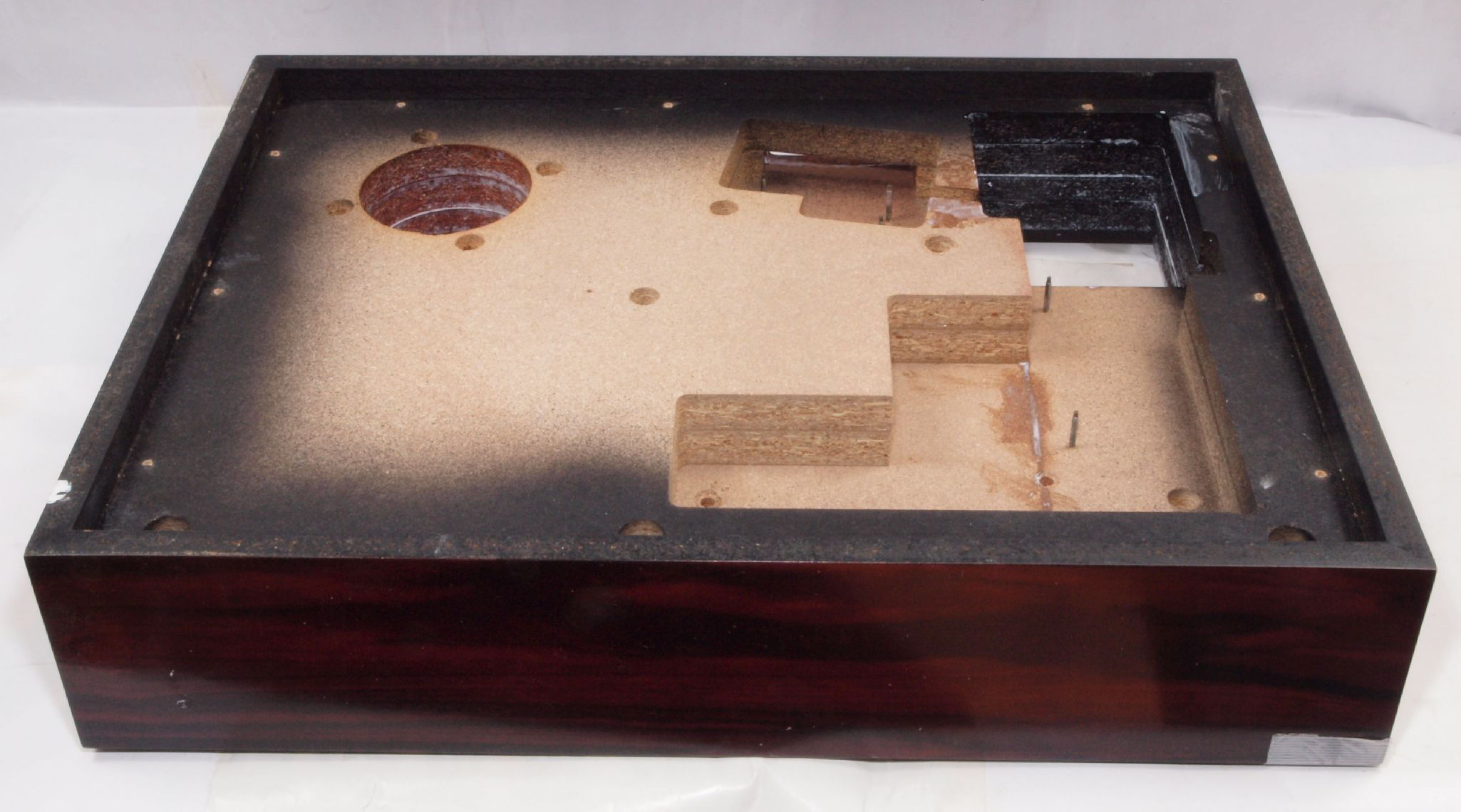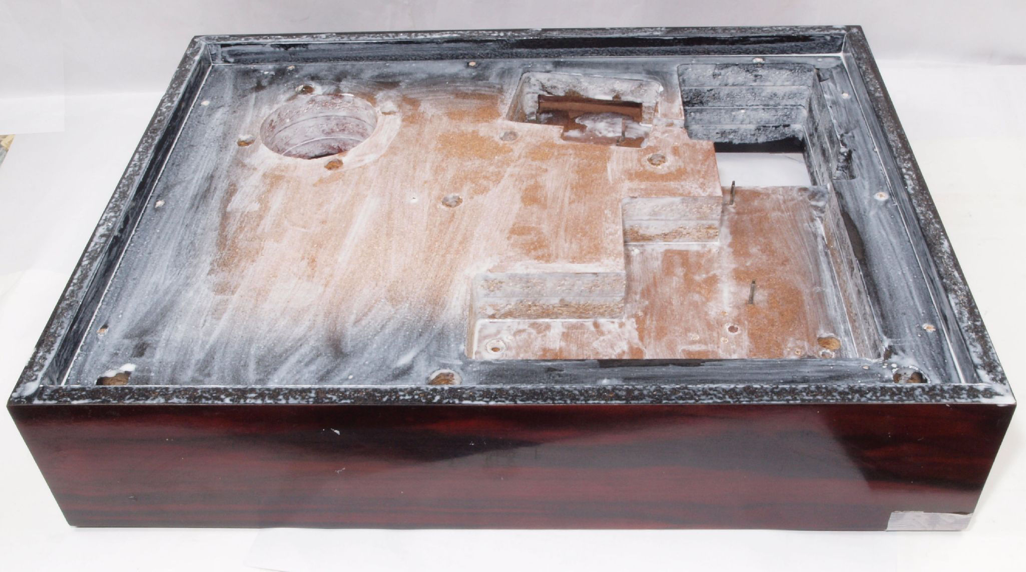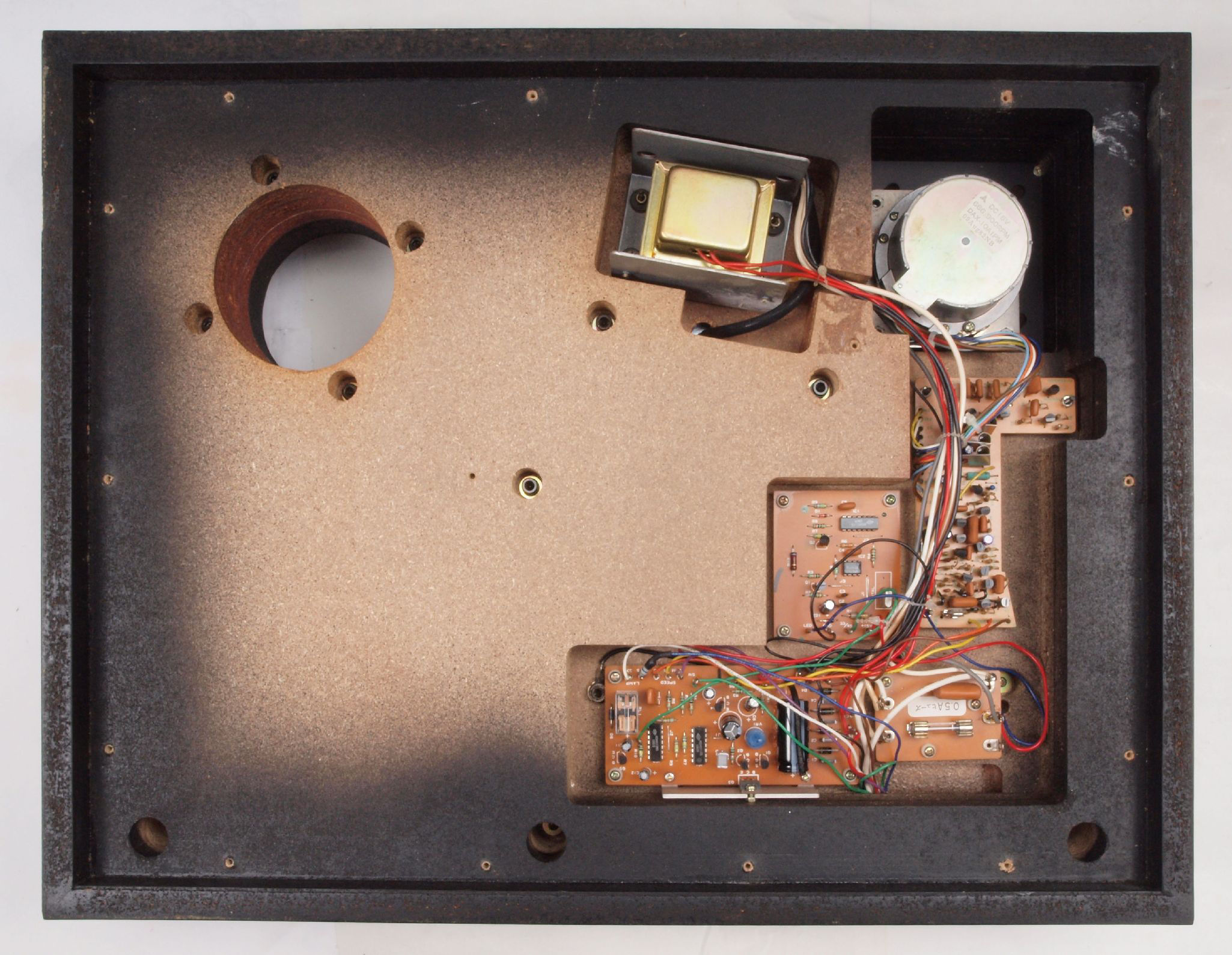| W. 下蓋及び本体木部 修理状況。 画像をクリックすると、大きく(横幅2050ドット)表示されます。 W1. 修理前 モーター、基板、アーム架台を取り本体上から。 |
