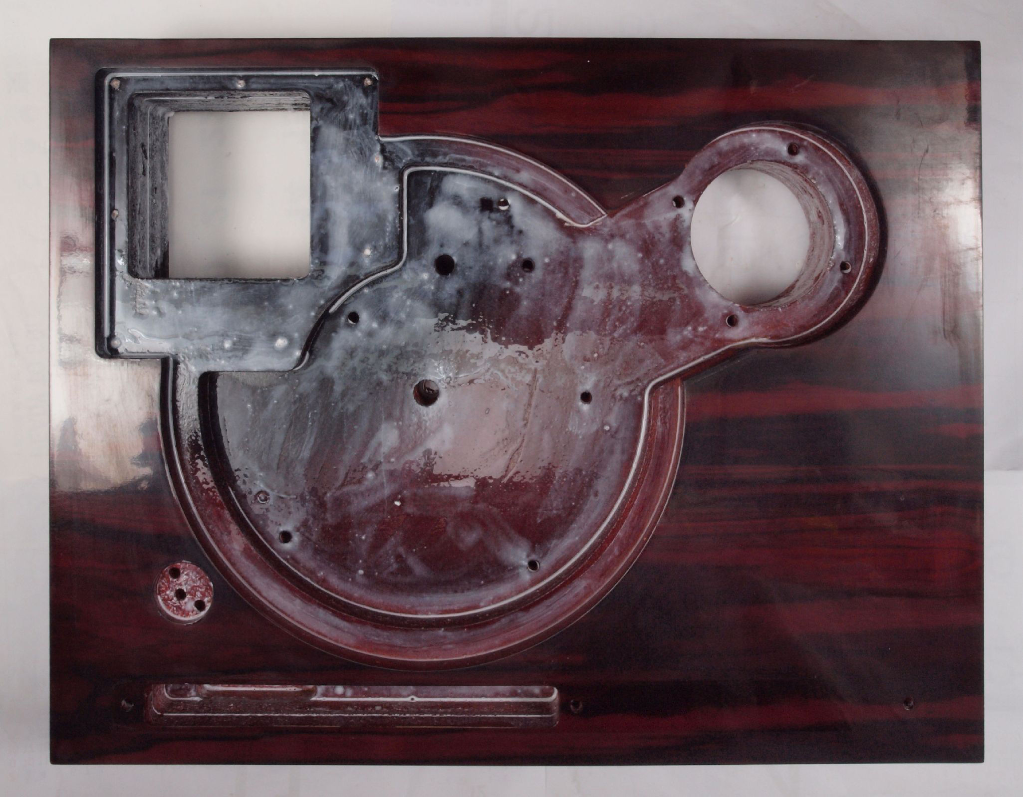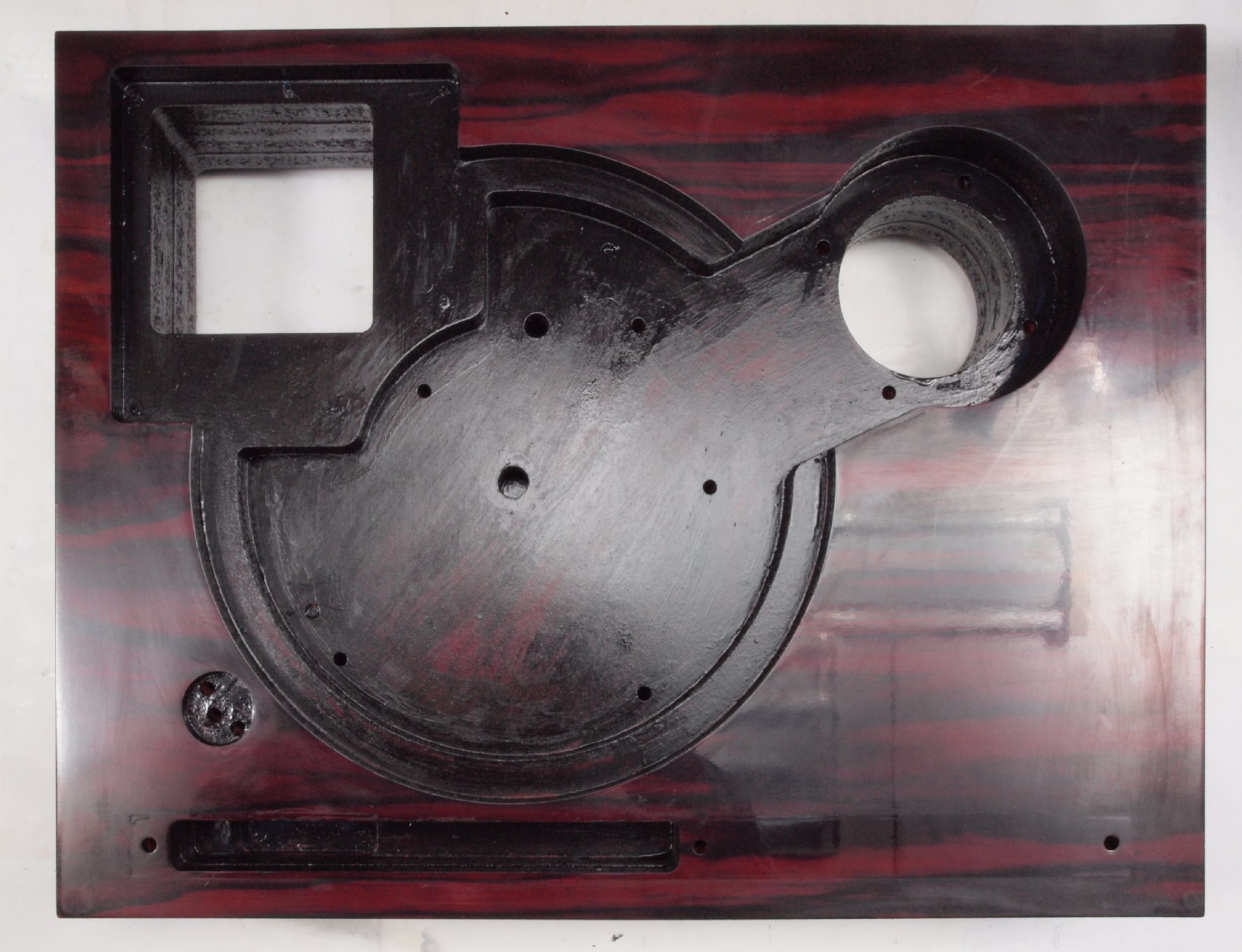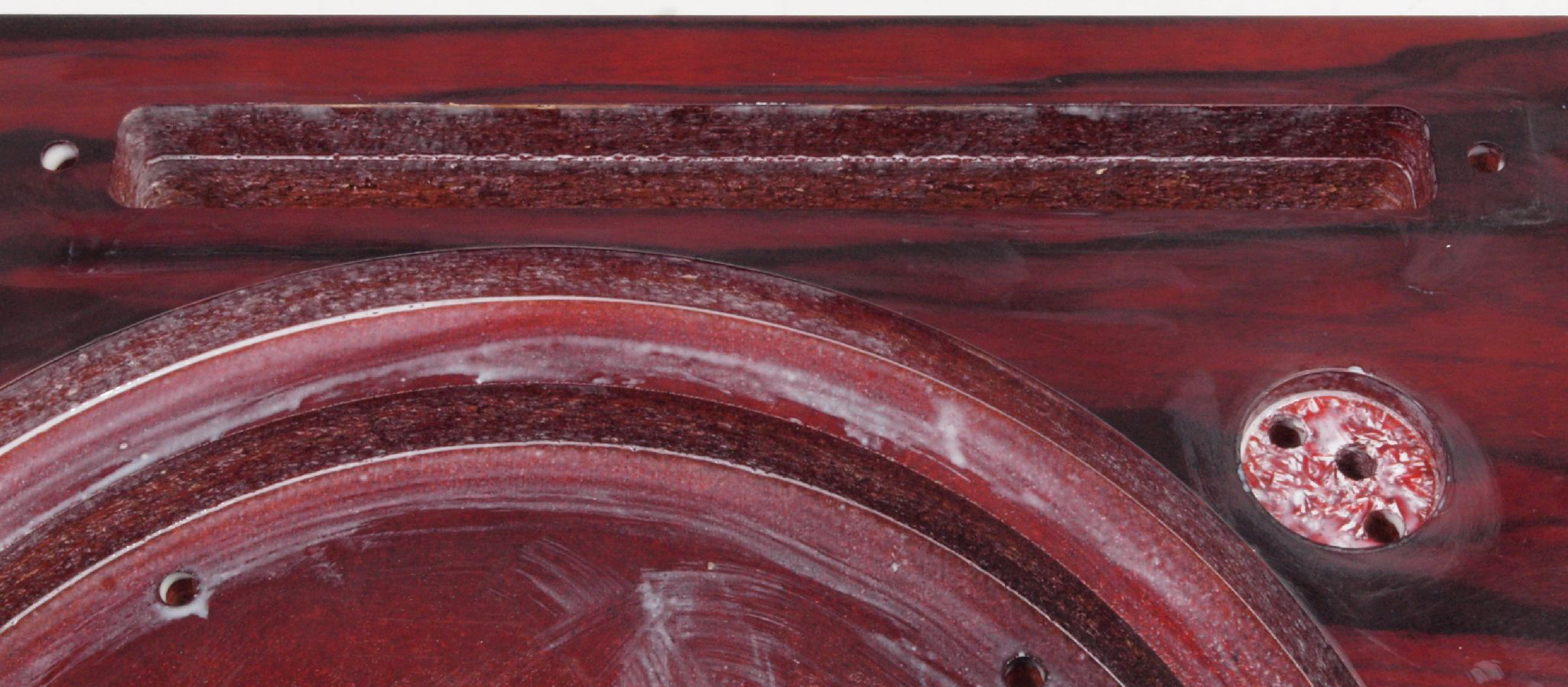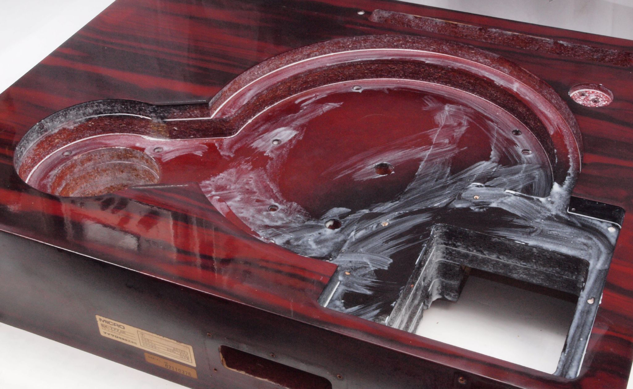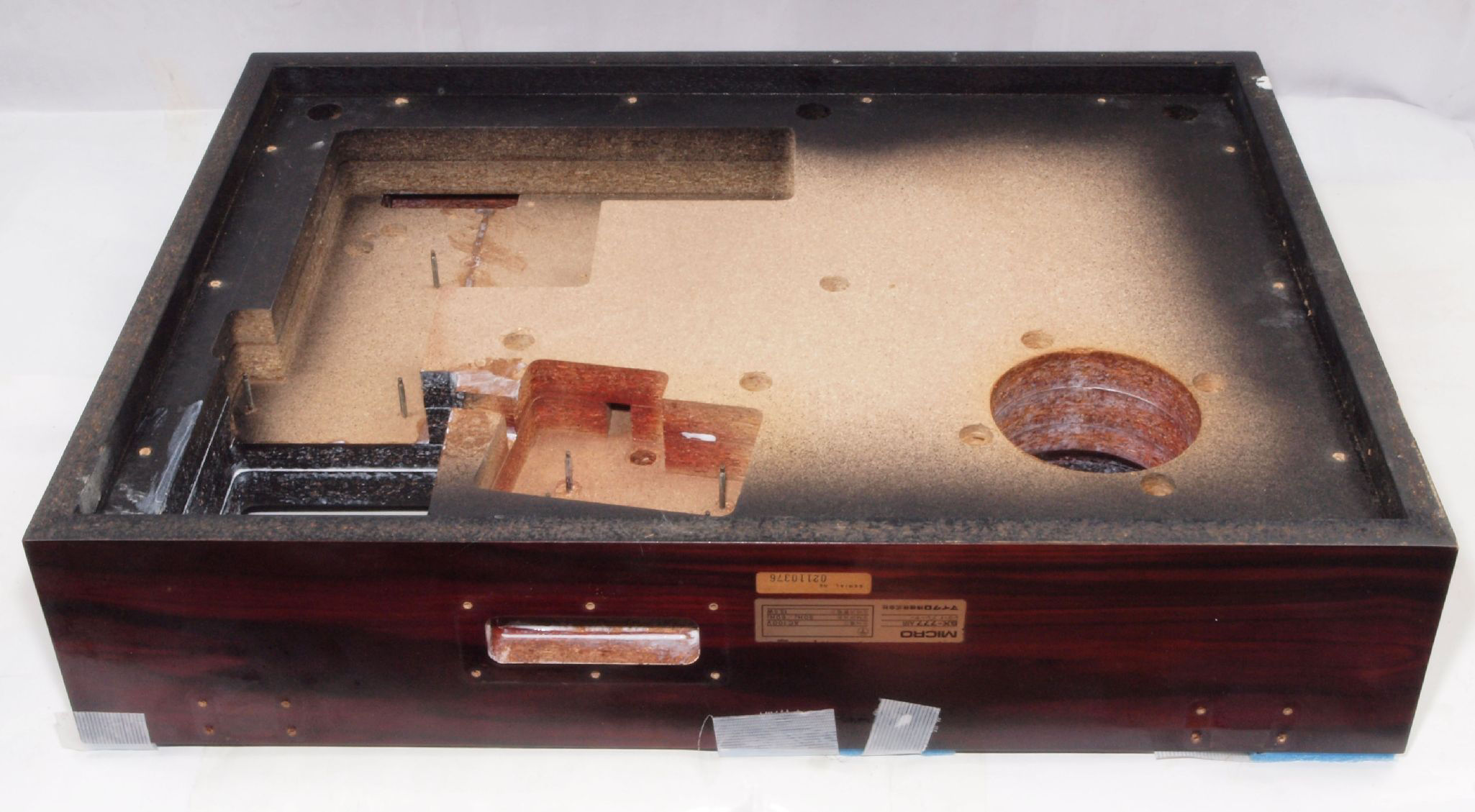 | W. 下蓋及び本体木部 修理状況。 画像をクリックすると、大きく(横幅2050ドット)表示されます。 W1. 修理前 モーター、基板、アーム架台を取り本体上から。 |