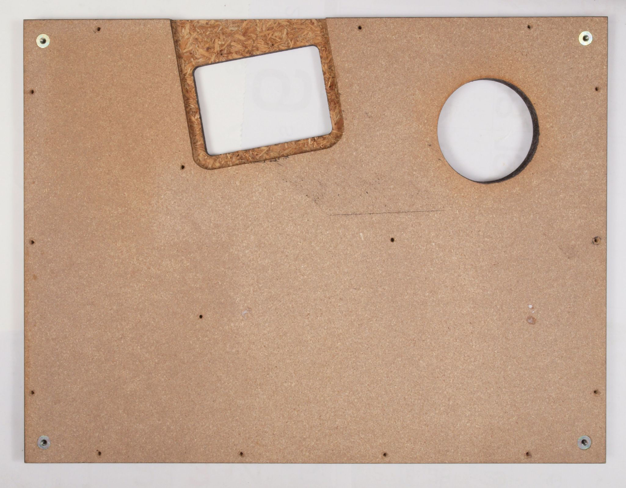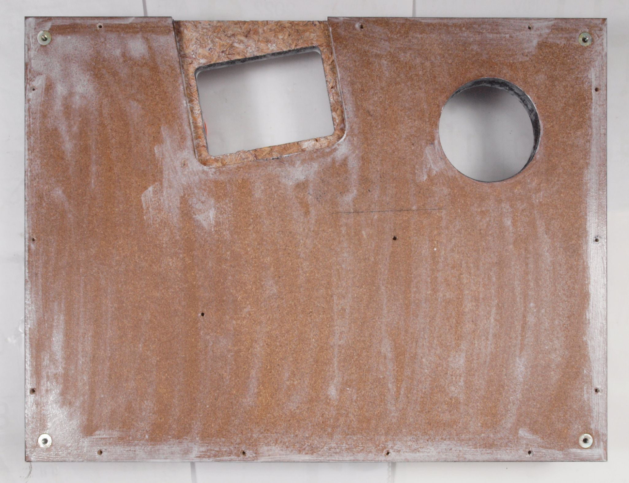 | W42. 修理中 本体木枠下前。 圧縮材にボンドを染みこませる、ネジ穴も塗る。 | ||||||||||||||||||||||||