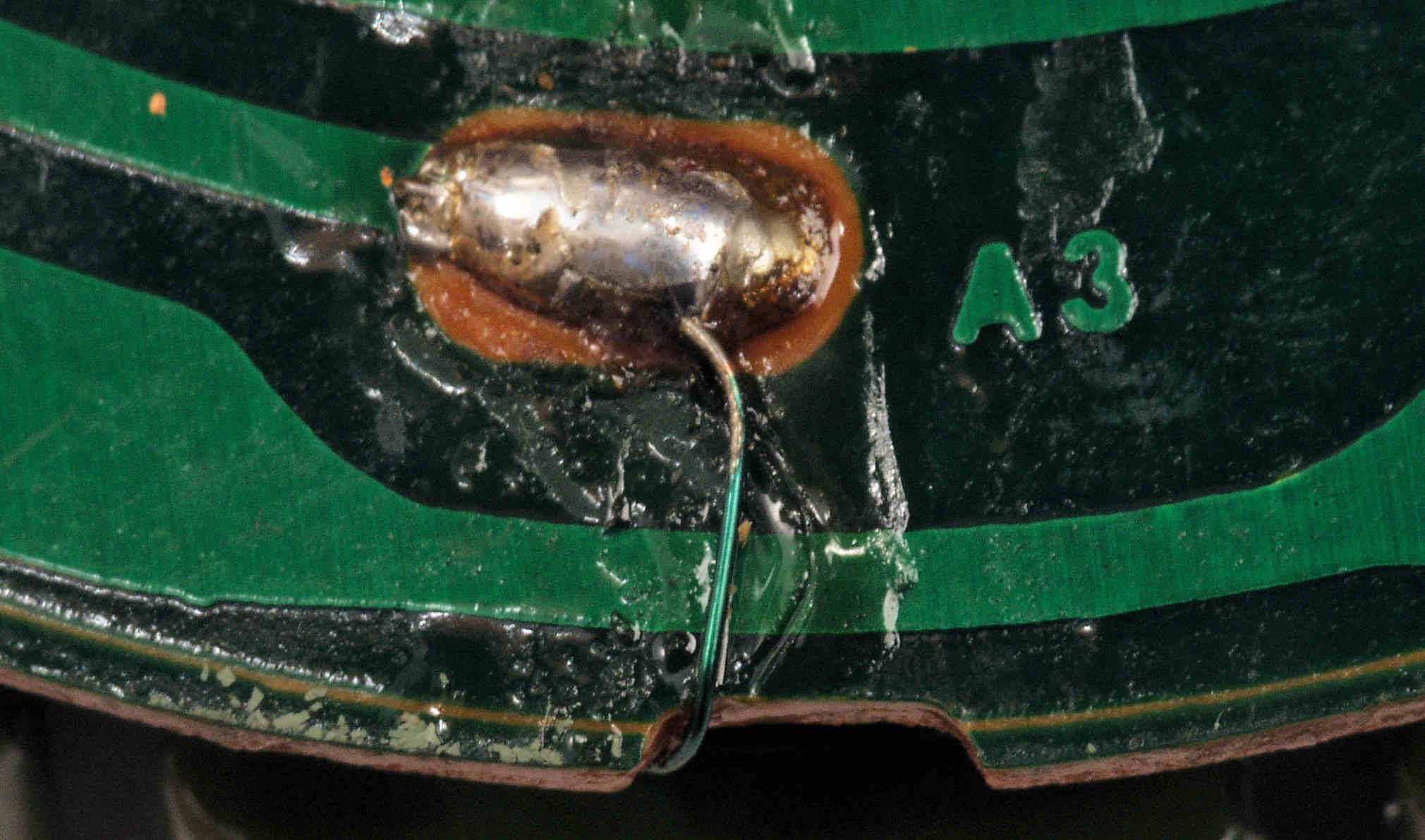 M13. 修理前 アマチュアコイルの引き出し線A2、 エナメル線の絶縁+レジスト液のみで!。