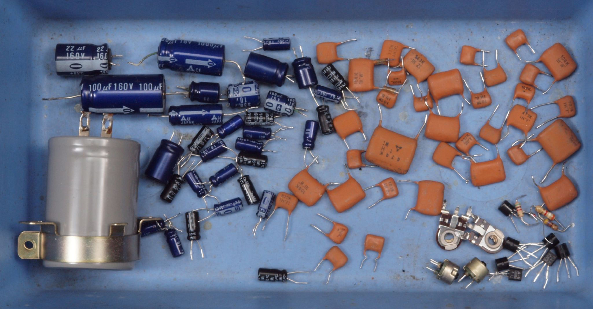 | C112. 修理前 電源定電圧基板、電解コンデンサーの液漏れ跡 | ||||||||||||||||||||||||||||||||||||