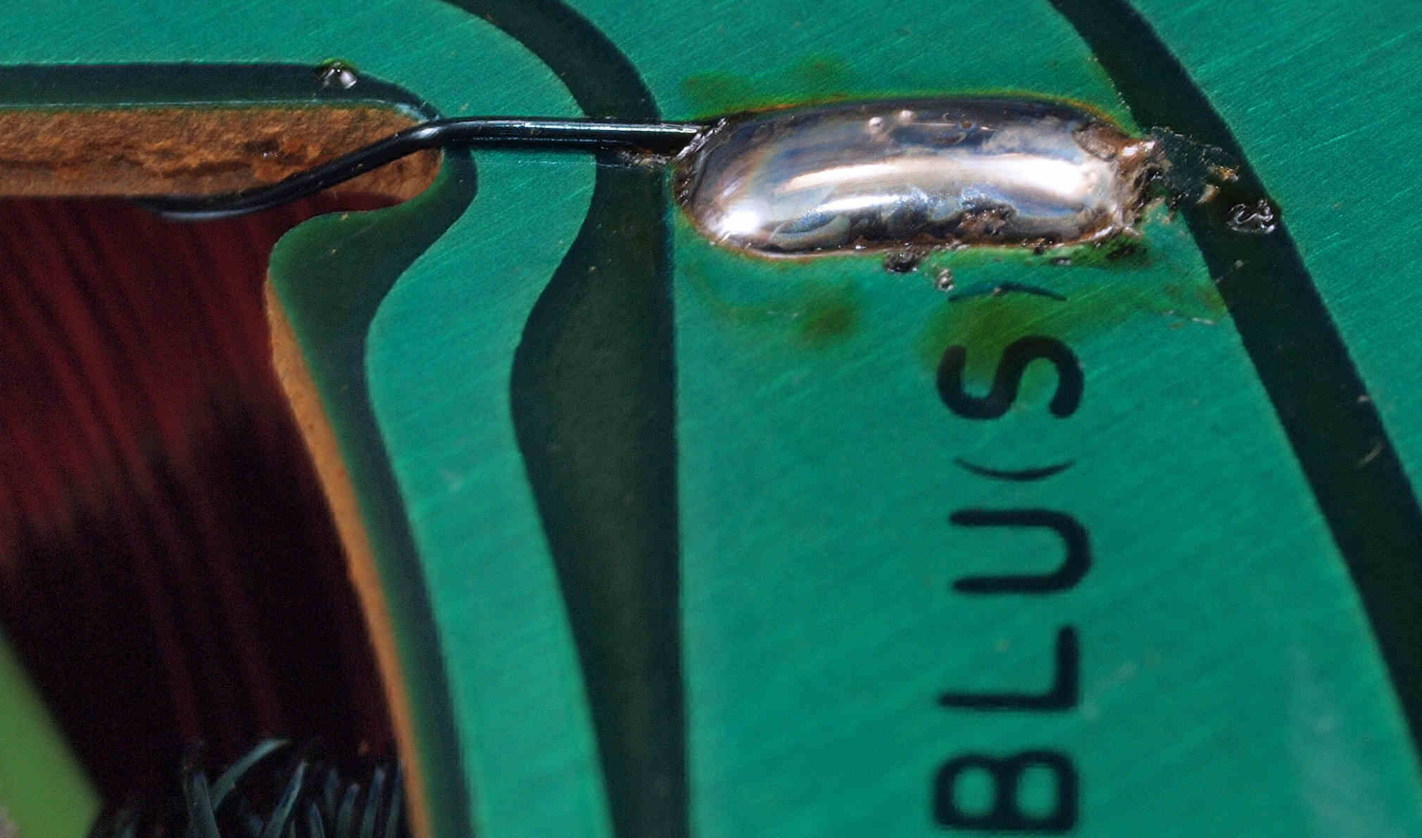M413. 修理中、 アマチュア(回転子)基盤裏巻線半田、引き出し線が絶縁していない!(BLUE巻線)拡大