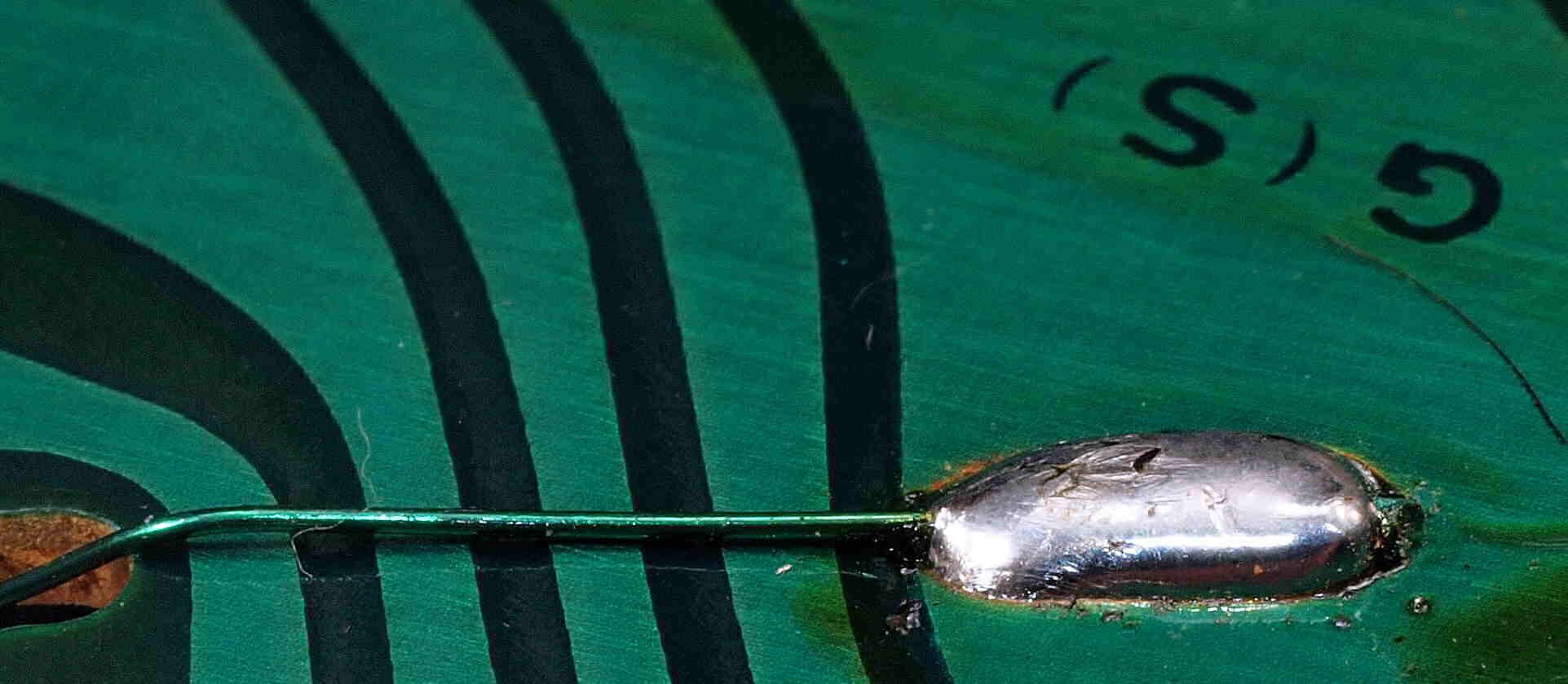 M513. 修理中、 アマチュア(回転子)基盤裏巻線半田、引き出し線が絶縁していない!(GREEN巻線)拡大