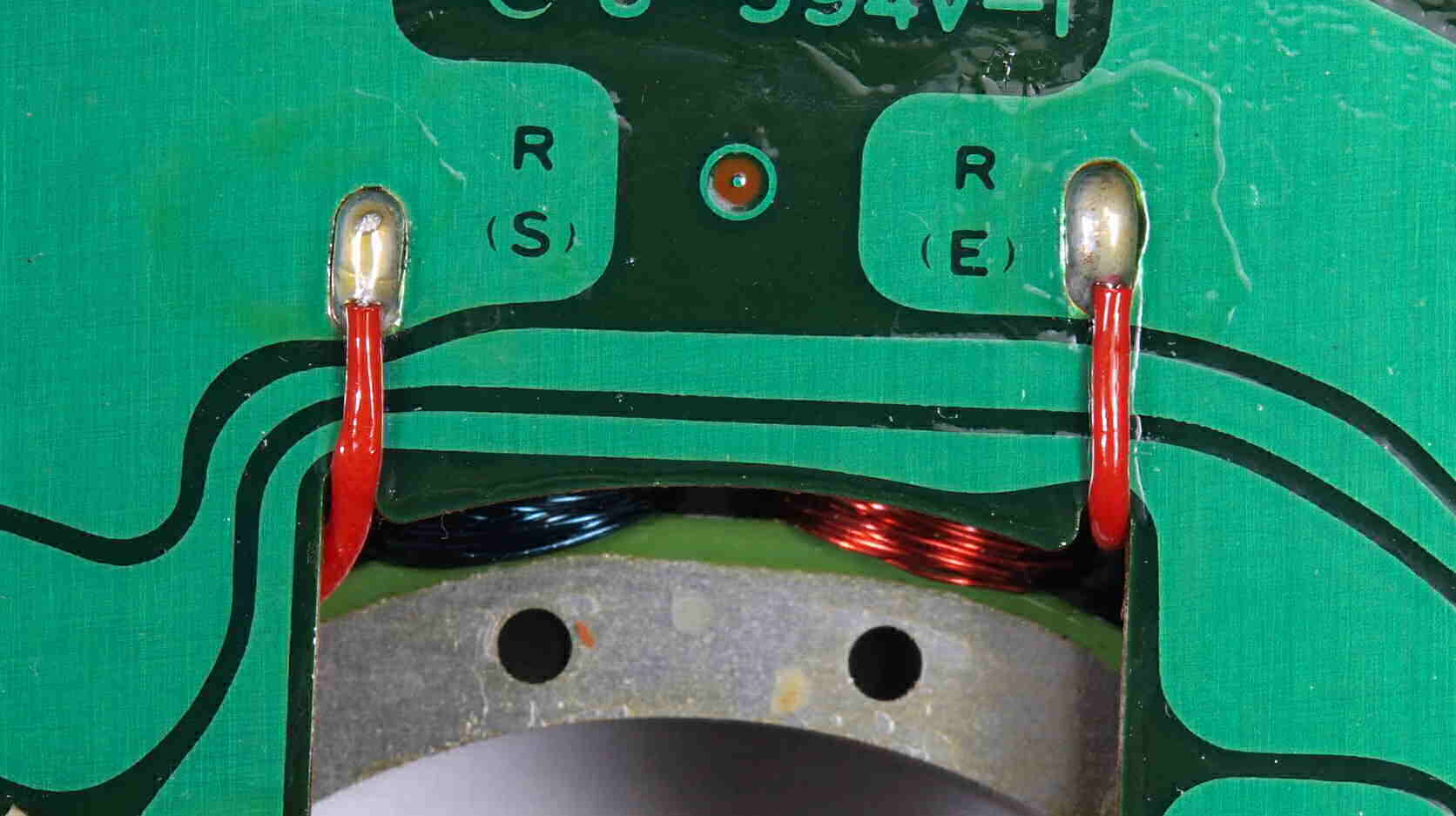 M312. 修理中、 アマチュア(回転子)基盤裏巻線半田、引き出し線が絶縁していない!(RED巻線)拡大