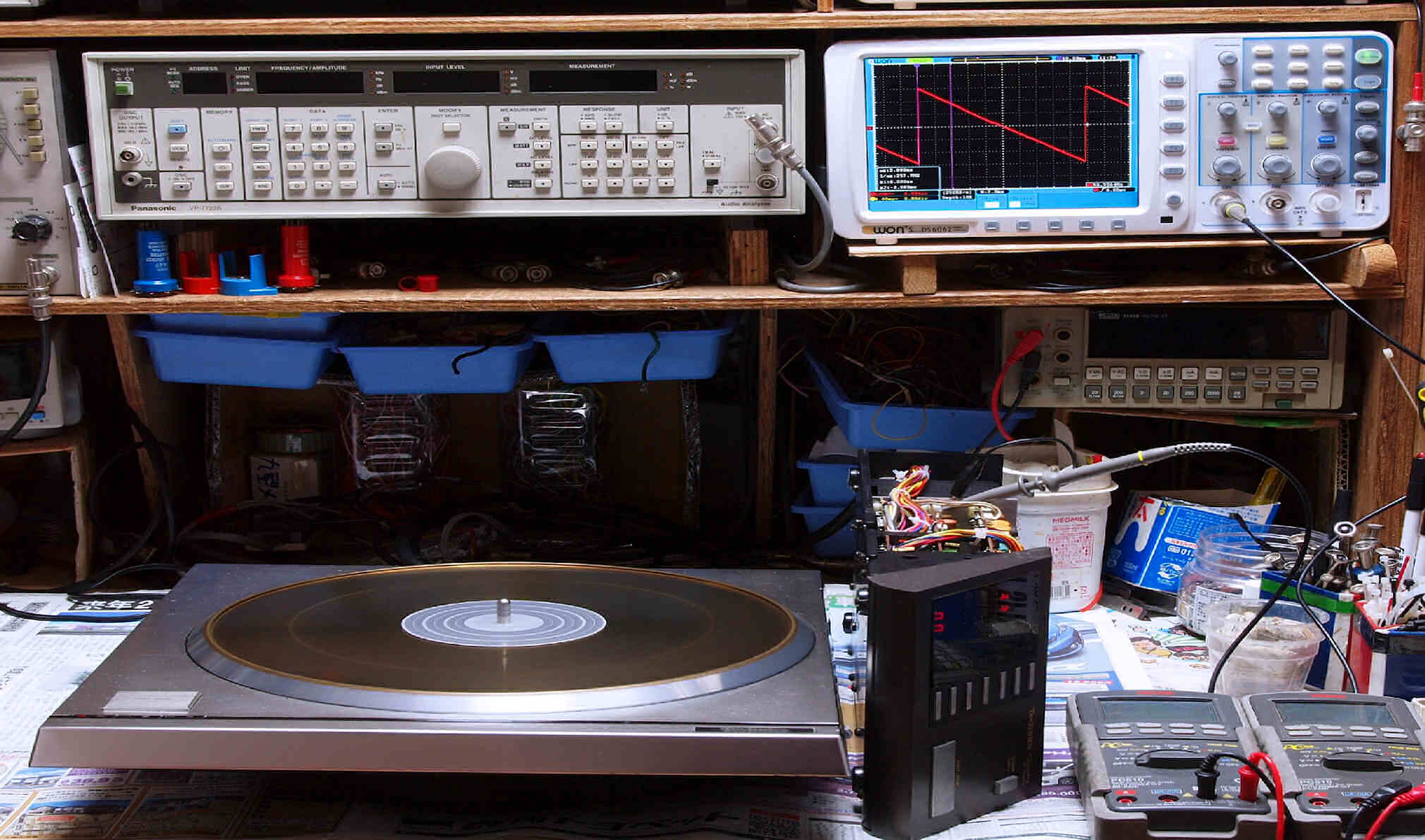 | E6. 完成し24時間連続動作エージング中 マイクロがベルトドライブ等の機械的機構で安定させたのに比べ、 純粋に電気で安定させている。 左は、13台目。 |