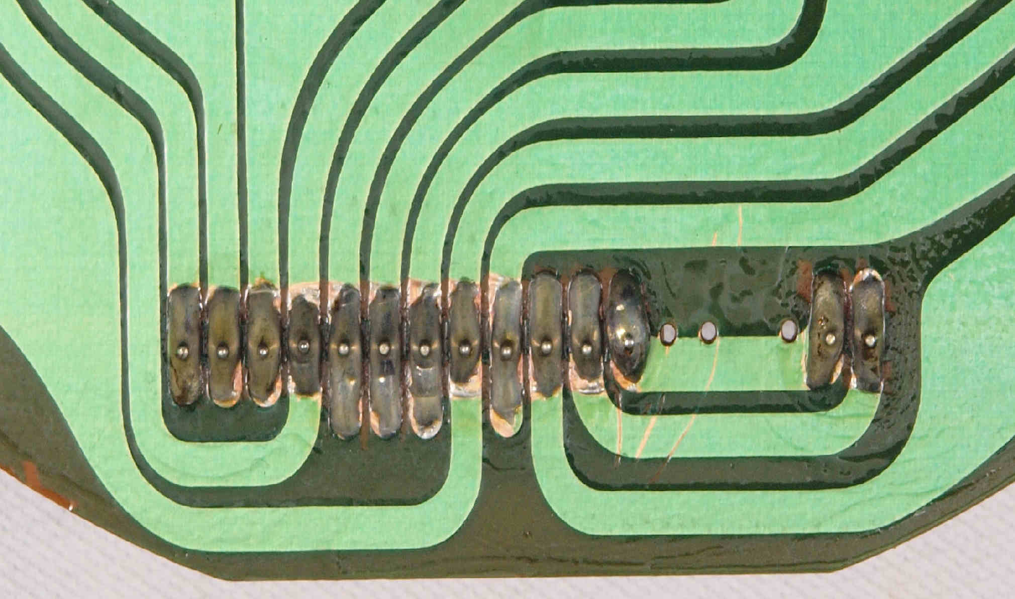 | M512. 修理中、 アマチュア(回転子)基盤裏巻線半田、引き出し線が絶縁していない!(GREEN巻線)拡大 | ||||||||||||||||||||||||||||||||||||||||