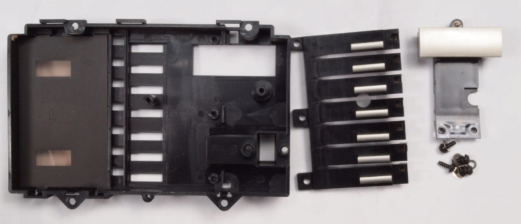 | C72. パネル分解・清掃・修理中。START−STOP押しボタンが柔らかくなっているので、バネに相当する部分にシリコンチュブを挿入して補強する。他のSW7個はプラスチックの跳ね返りを強める。 | ||||||||||||||||||||||||||||||||||||||||