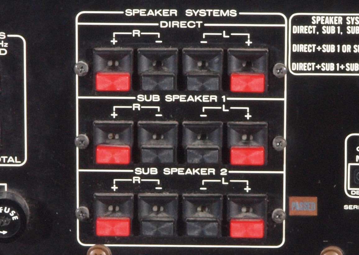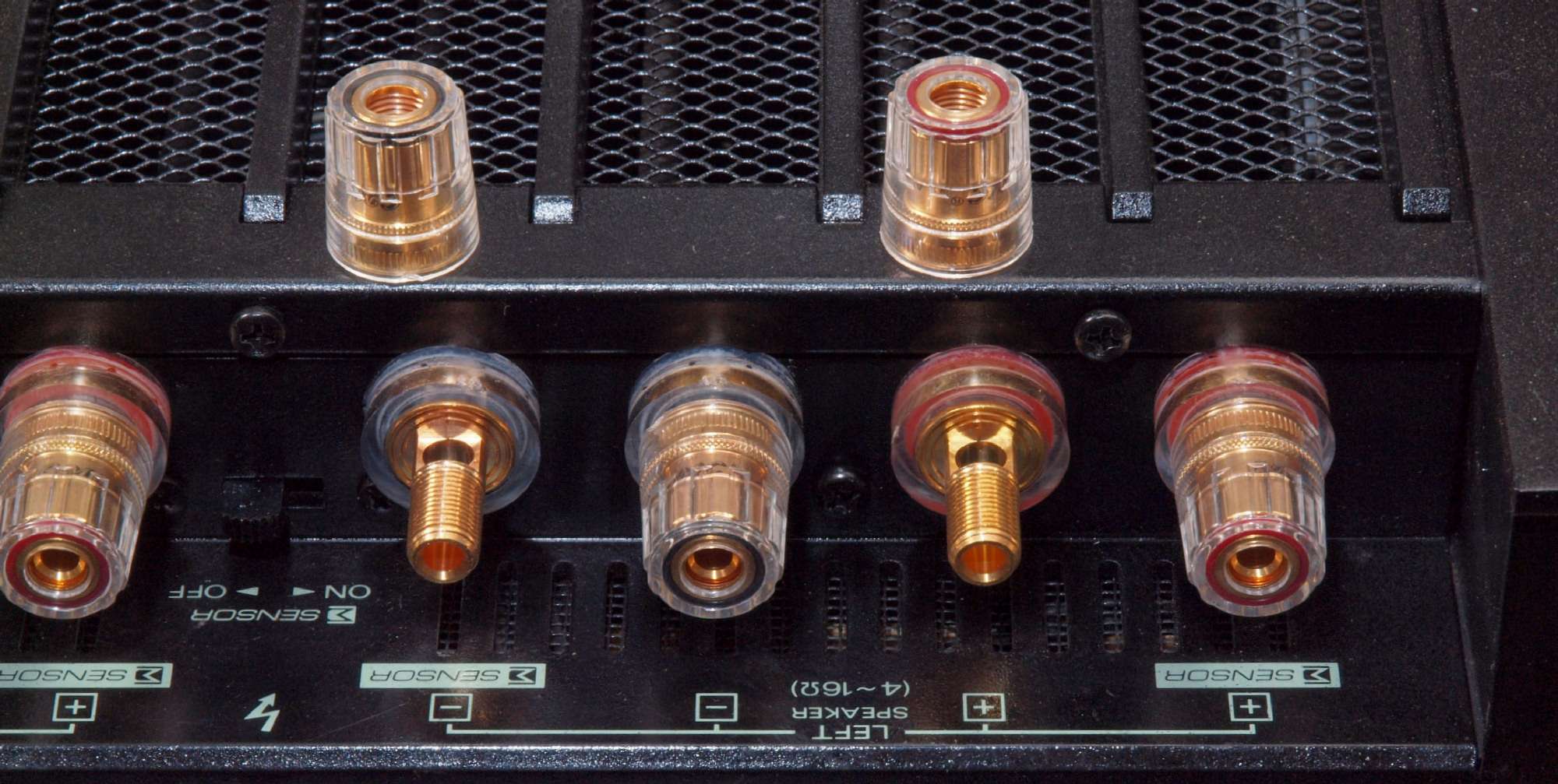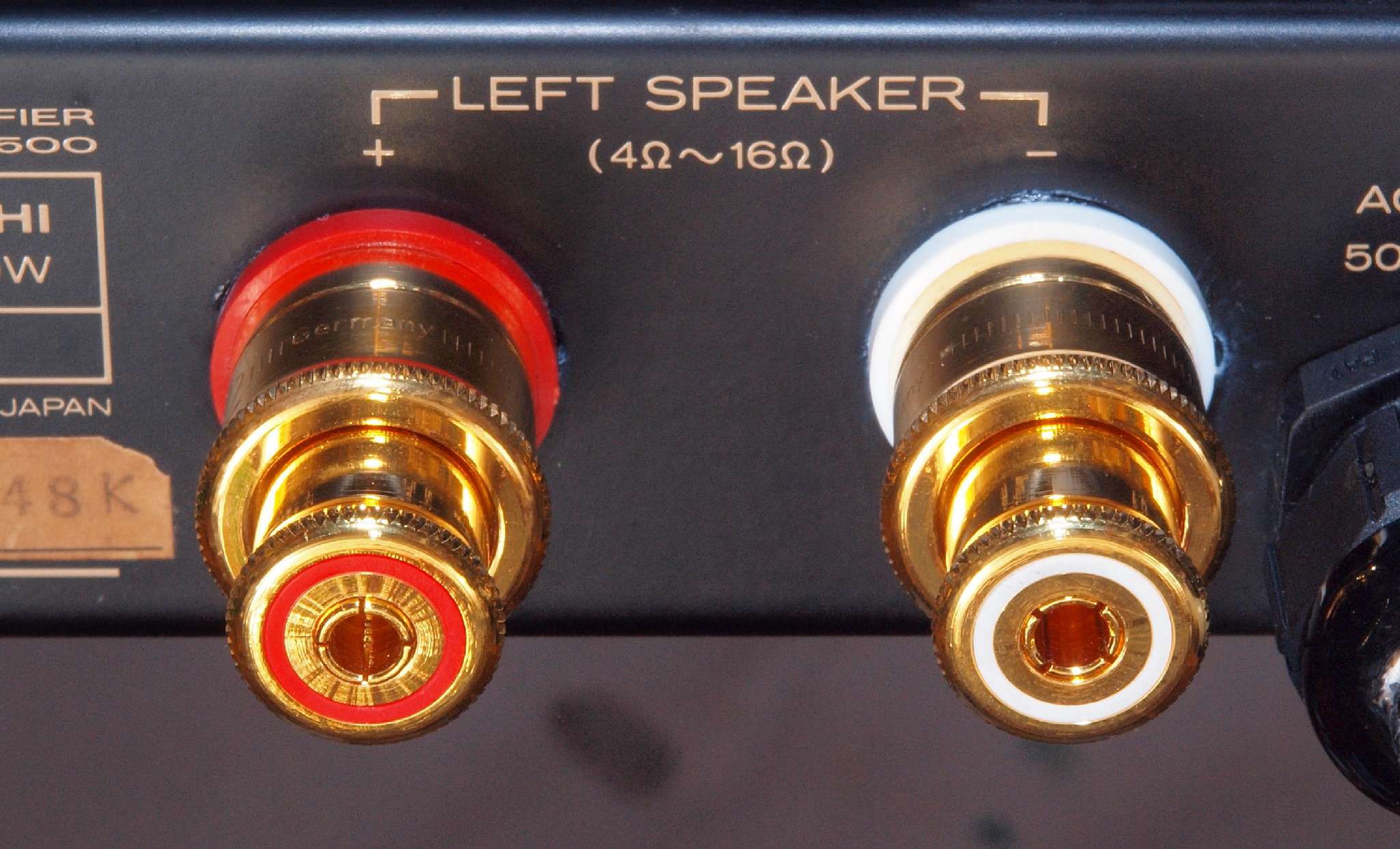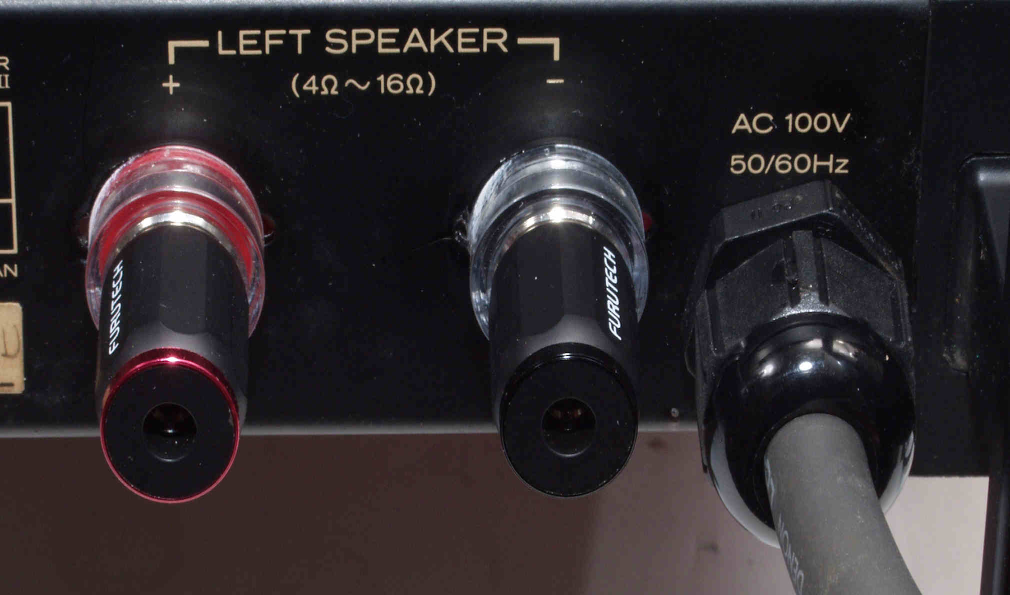 | 最近は、音質改善の為、極太のSP(スピーカー)ケーブルを使用する人が多い。 しかし、古い機器はそれら使用を想定しておらず、端子破損に成りやすい、出来る事なら、事前に補強すると良い。 又、ケーブルの重みで端子その物に負担が掛かり、接触不良や破壊に成りやすいので、架台等を利用してケーブルを固定して、端子に荷重が架からないようにすると良い。 |