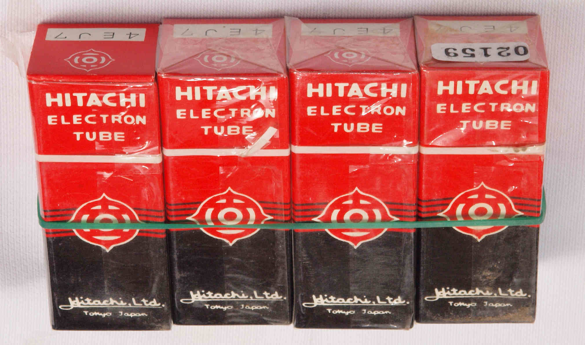 | G21. 未開封・未使用の「4EJ7」、綺麗です。 左から1本目.2.3.4本目。 相互コンダクタンス=15000μmho「Ep=200V、Esg=200V、IP=10mA、Eg1=−2.5V」 RC-26,RC-30 Receiving Tube Manual、世界の真空管カタログより。 |