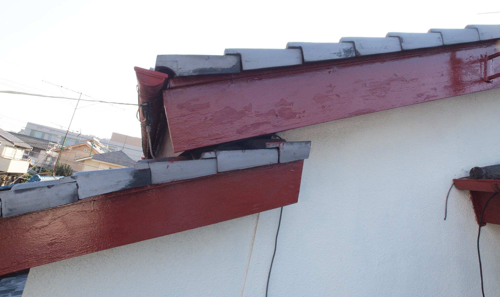 11. 修理中 2F中央 破風板北側、1回目の塗装終了、拡大。