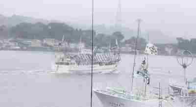 汽笛を鳴らしながら出漁する船
