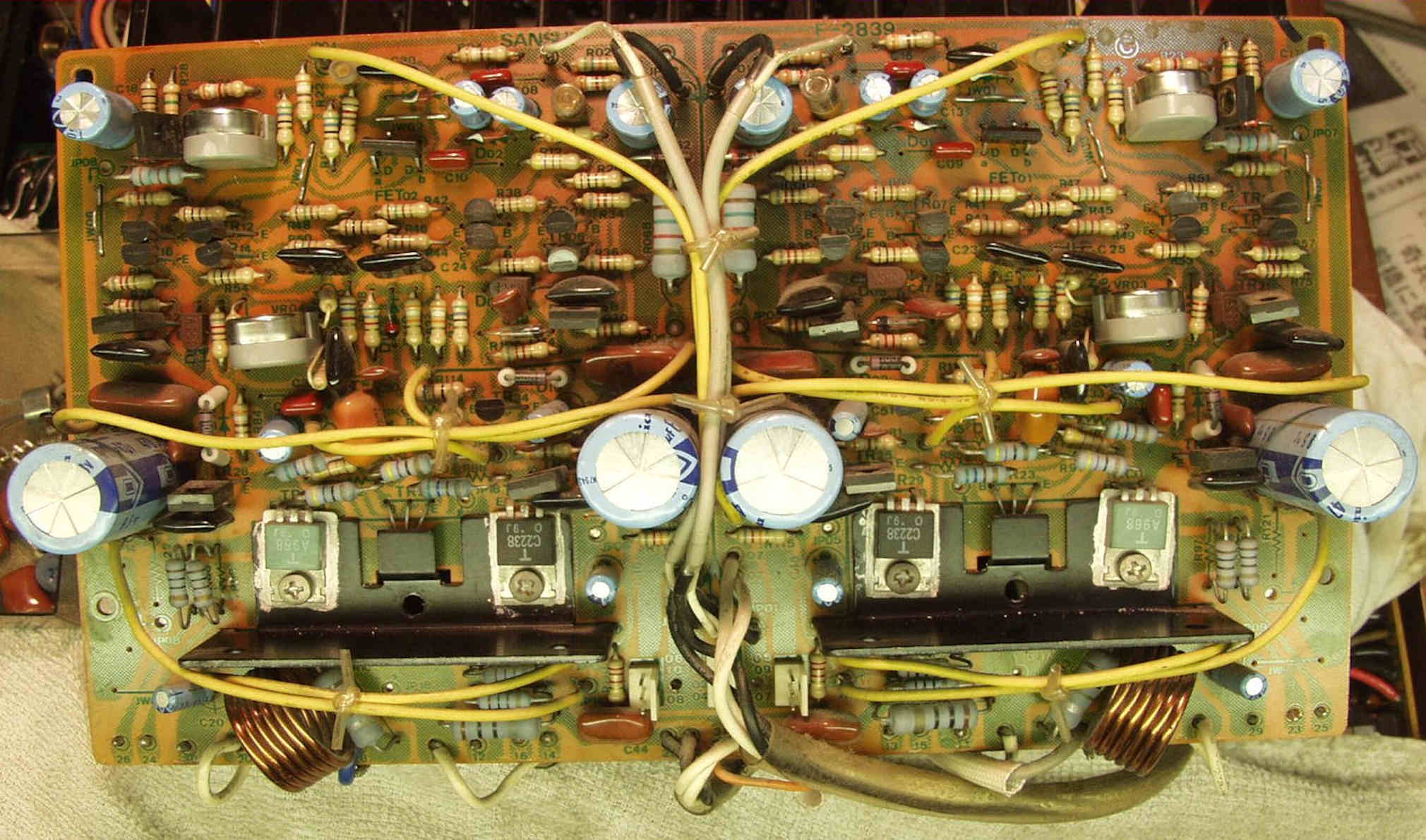 | 7.ドライブ基板修理後、交換部品は半固定VR=4個、複合FET(電界効果トランジスター)=2個 音質改善のため、ペーパー・コンデンサーをメタライズド・フイルムコンデンサーに交換 |