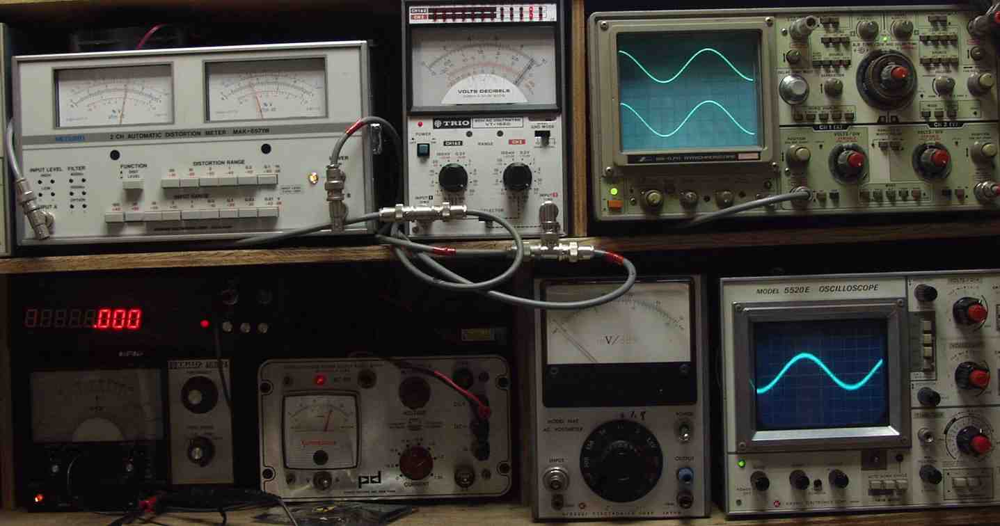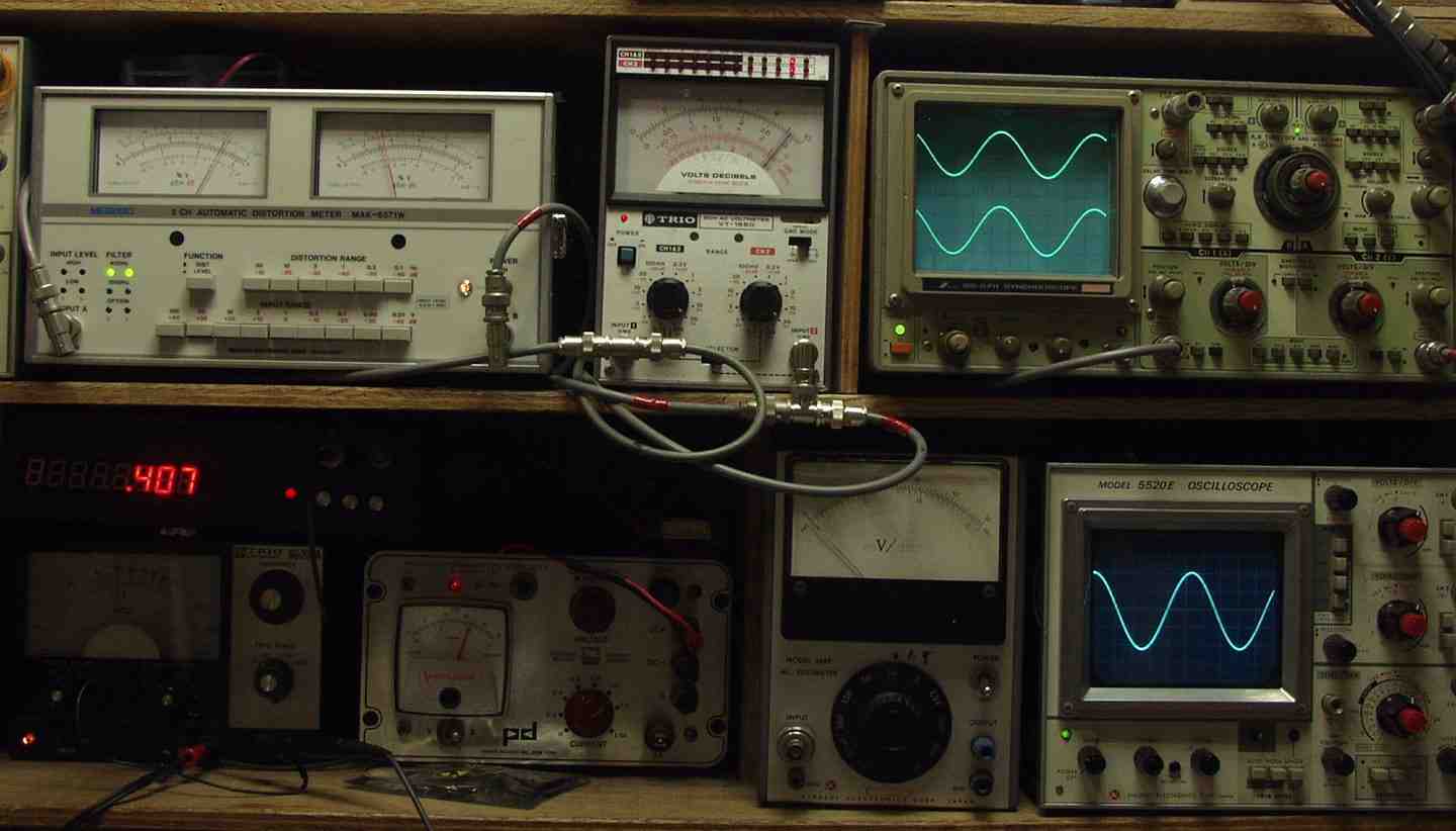 | 15.29V=105W/8Ω 歪み率=0.06% at=1000HZ MM端子入力 右=赤針=上、左=黒針=下、右下オシロ=入力波形 |